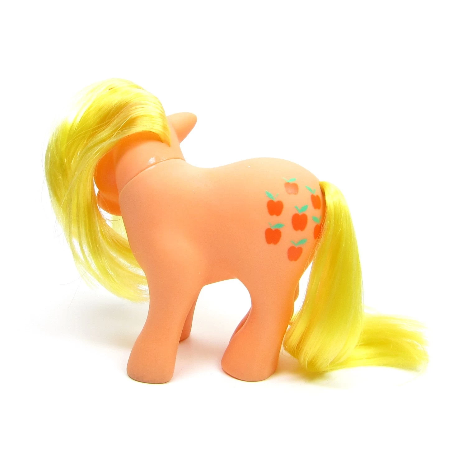 This vintage G1 My Little Pony is Applejack. She’s orange with yellow hair and white freckles on her face. Her symbol is 7 red apples with green leaves. This version of her was released in Year 3Â and has longer hair than the Year 2Â version.