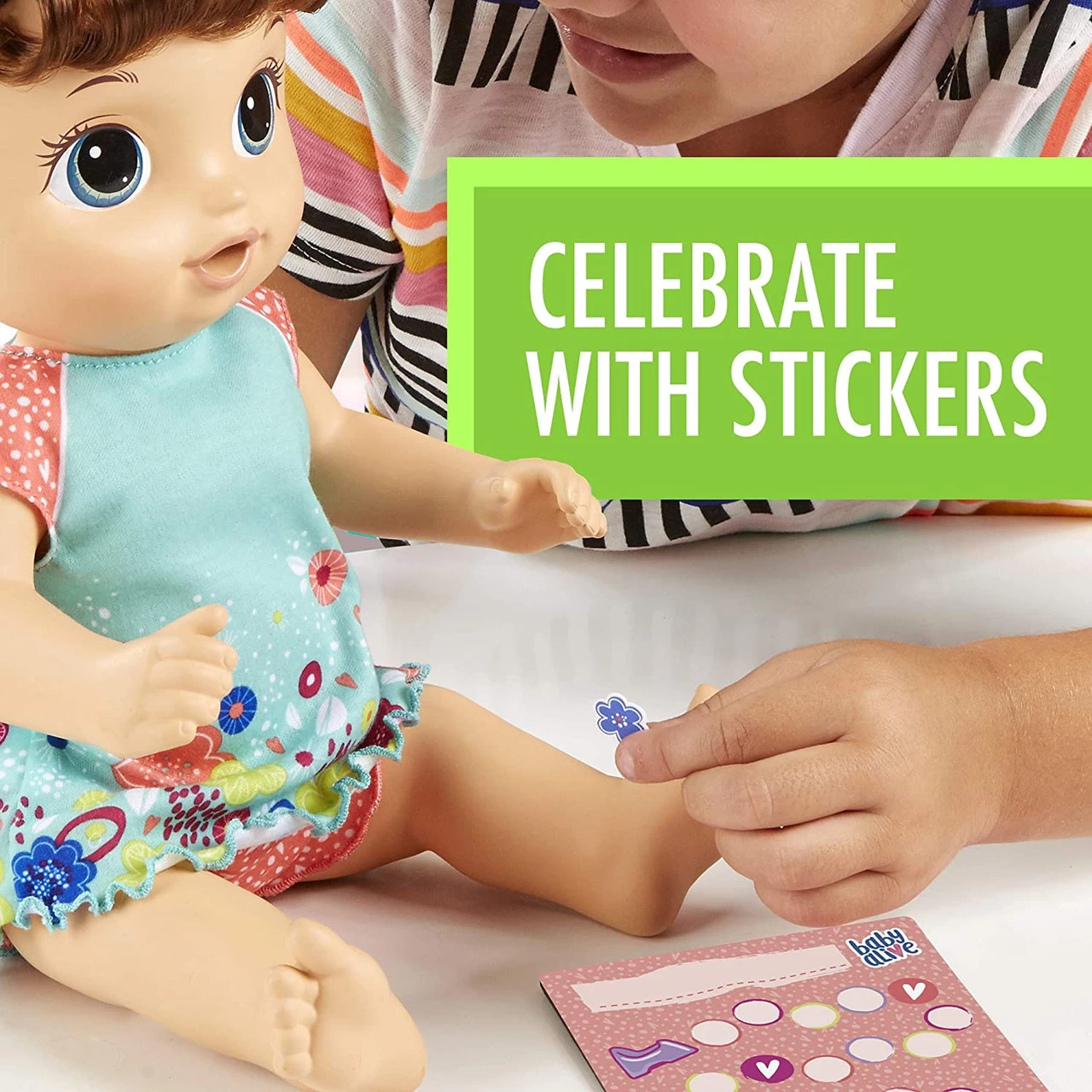 - Time to go & celebrate: give baby her bottle and she’ll “pee” on her potty. Mark baby’s progress with stickers and a rewards chart to celebrate when she does it!