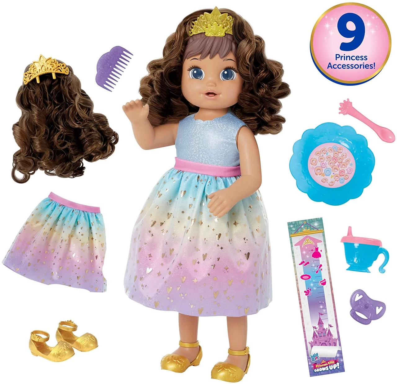 - SHE REALLY GROWS INTO A PRINCESS: With kids’ care, this Baby Alive grow up doll grows into a princess doll! She starts at 14 inches (37 cm) and grows to 18 inches (45 cm) by rocking her and using her nurturing baby doll accessories