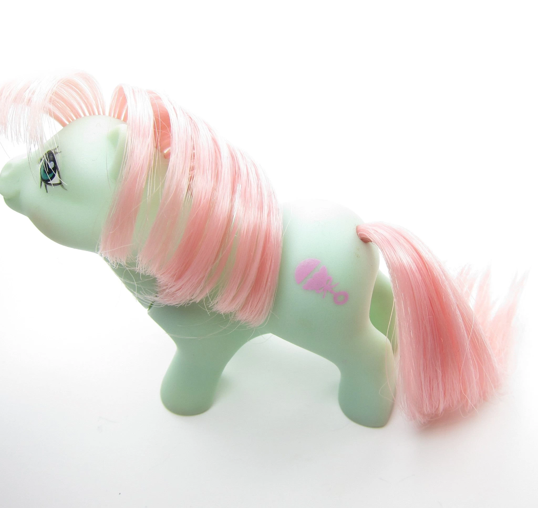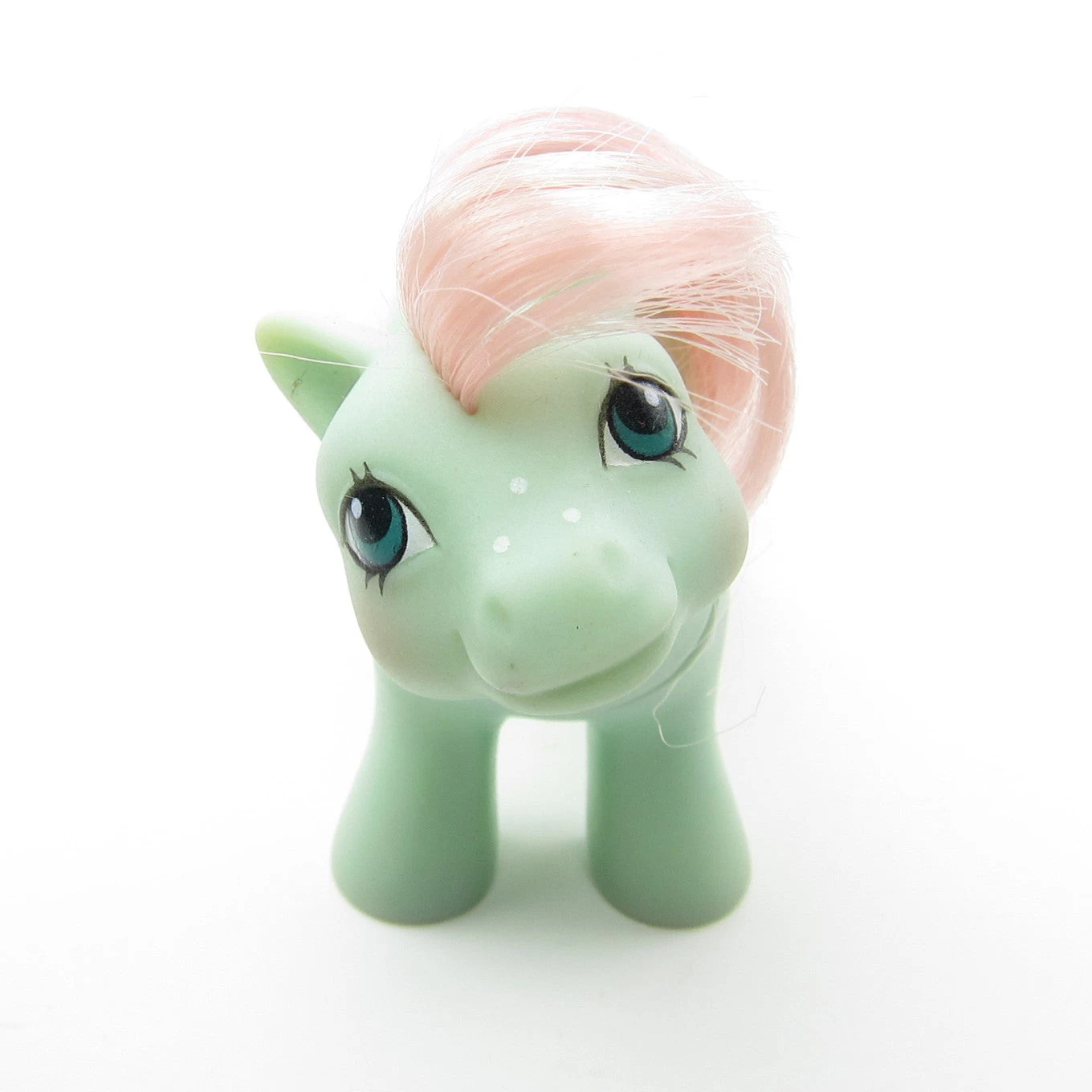 This vintage My Little Pony is Baby Cuddles, she’s a playset pony that originally came with the Baby Buggy.
