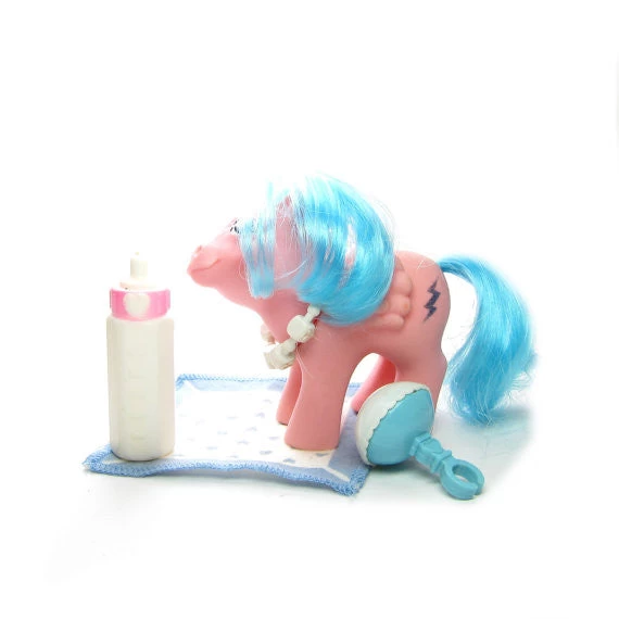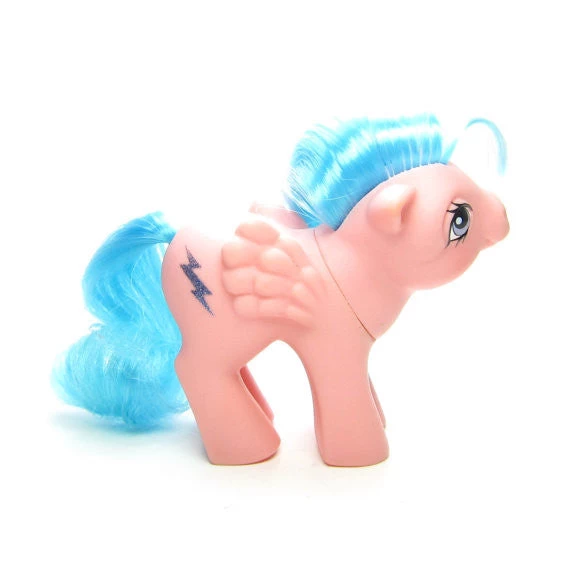 This vintage My Little Pony is Baby Firefly, she’s a pink pegasus with turquoise hair. She has purple eyes and her symbol is a glittery blue lightning bolt instead of the two lightning bolts of the adult Firefly. Her head is tilted upward, which gives her a sweet and innocent expression.Â