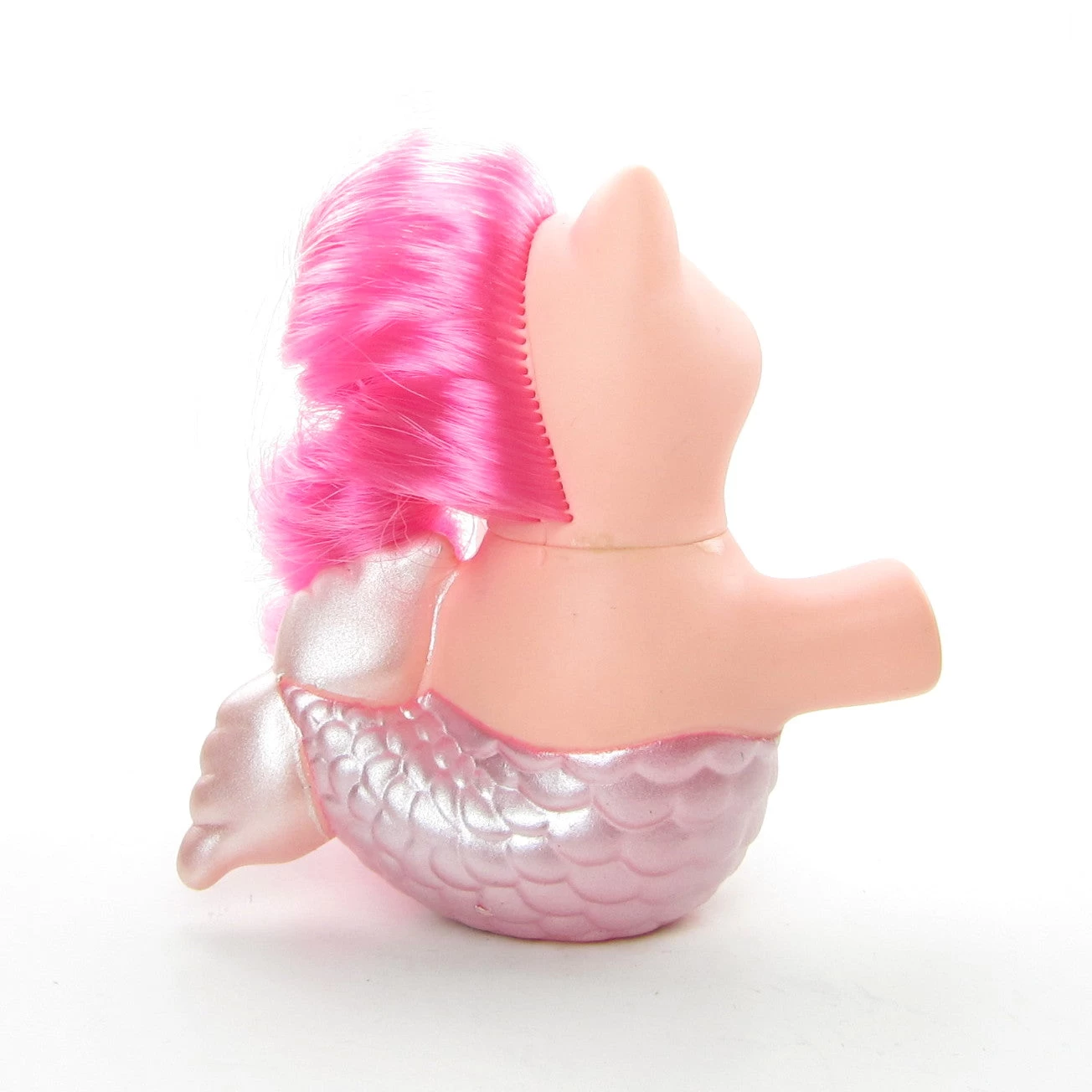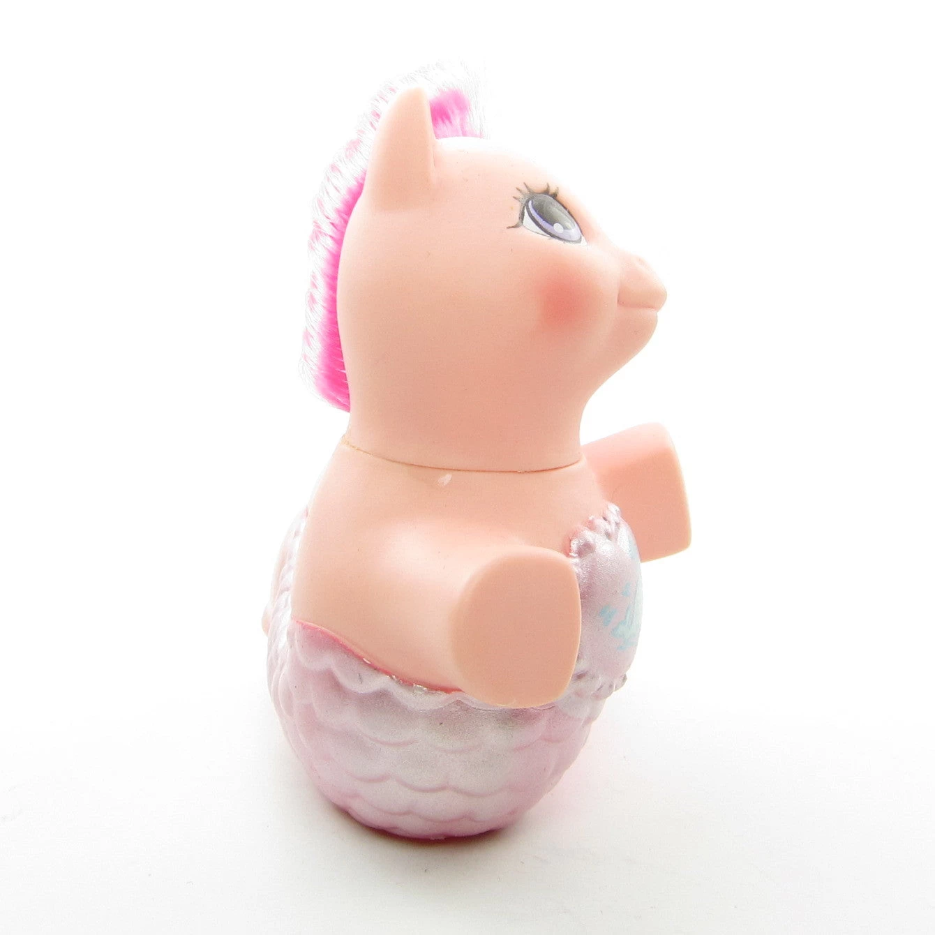 This vintage My Little Pony is Baby Pearly, she’s a pink baby mermaid pony with bright pink hair and light purple eyes. She’s one of the Fancy Mermaid Ponies from Year 10.Â