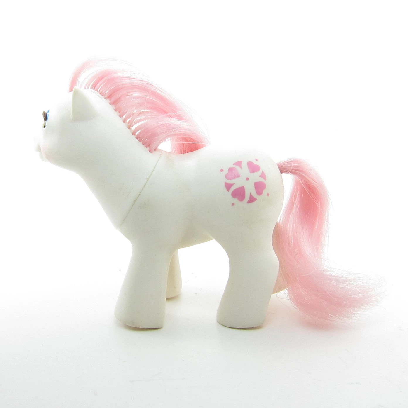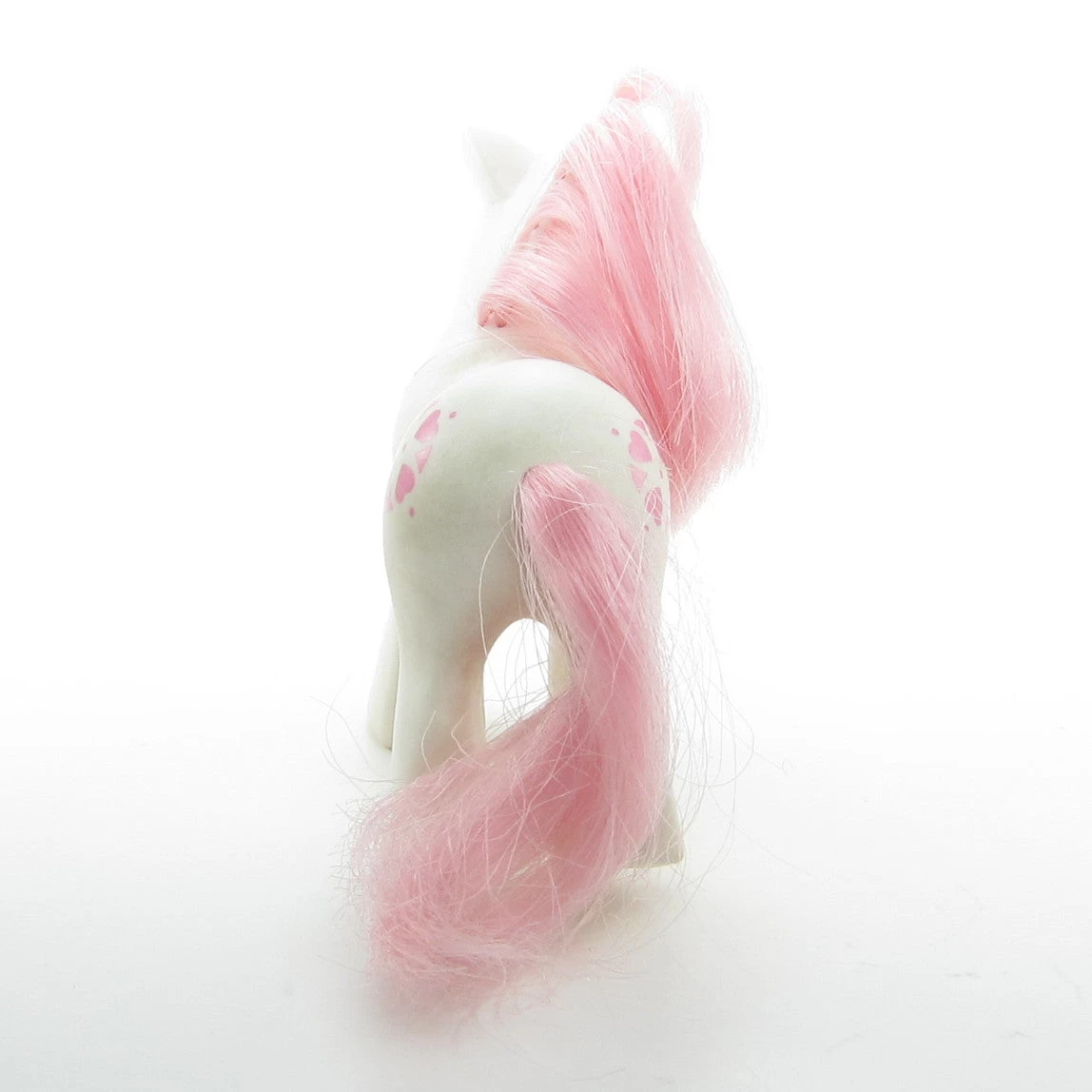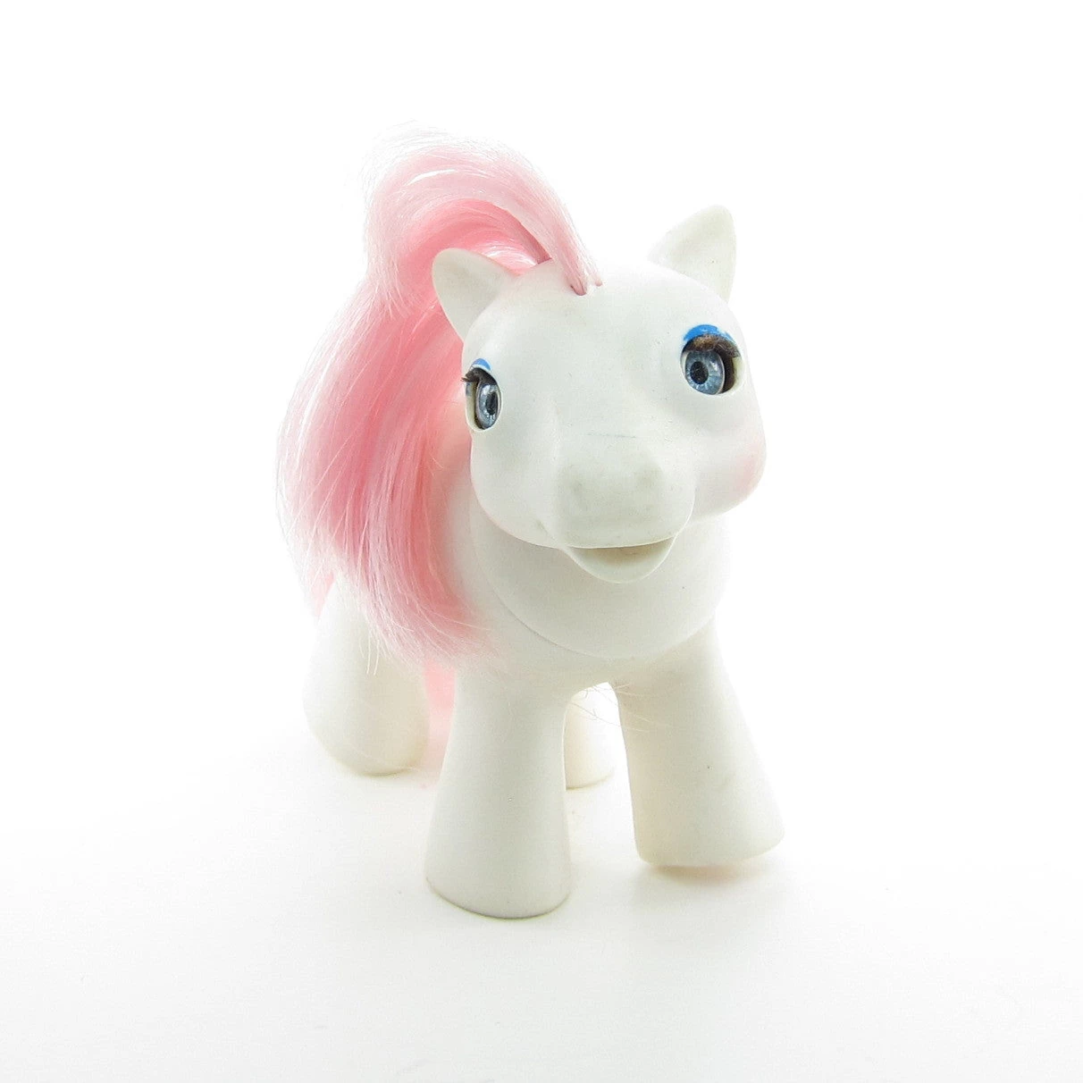 This vintage G1 My Little Pony is Baby Sundance, she’s a white Earth pony with pink hair, blue eyes, and a symbol with pink hearts and dots in a circle. She has Beddy Bye Eyes, so her eyes close when you lay her down.