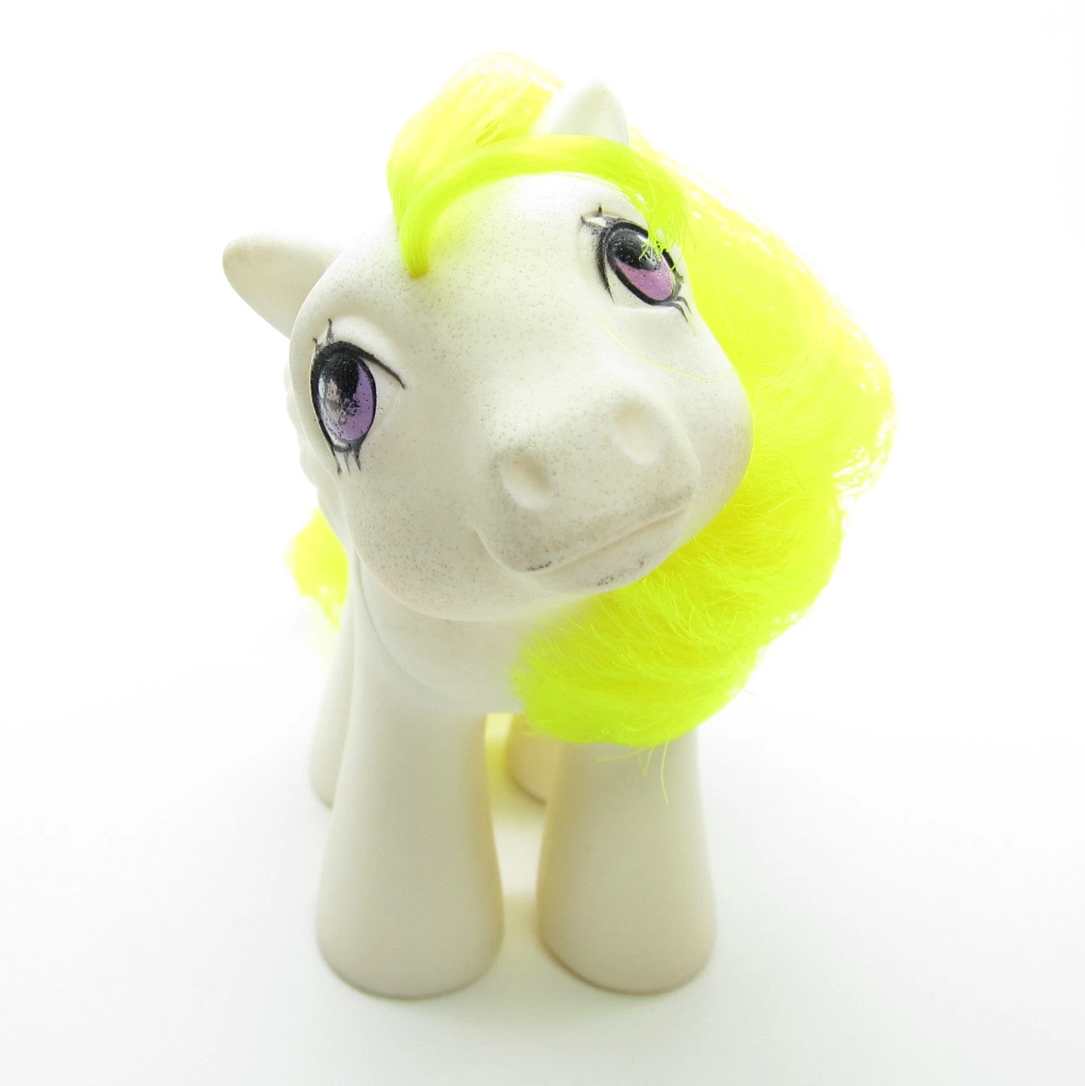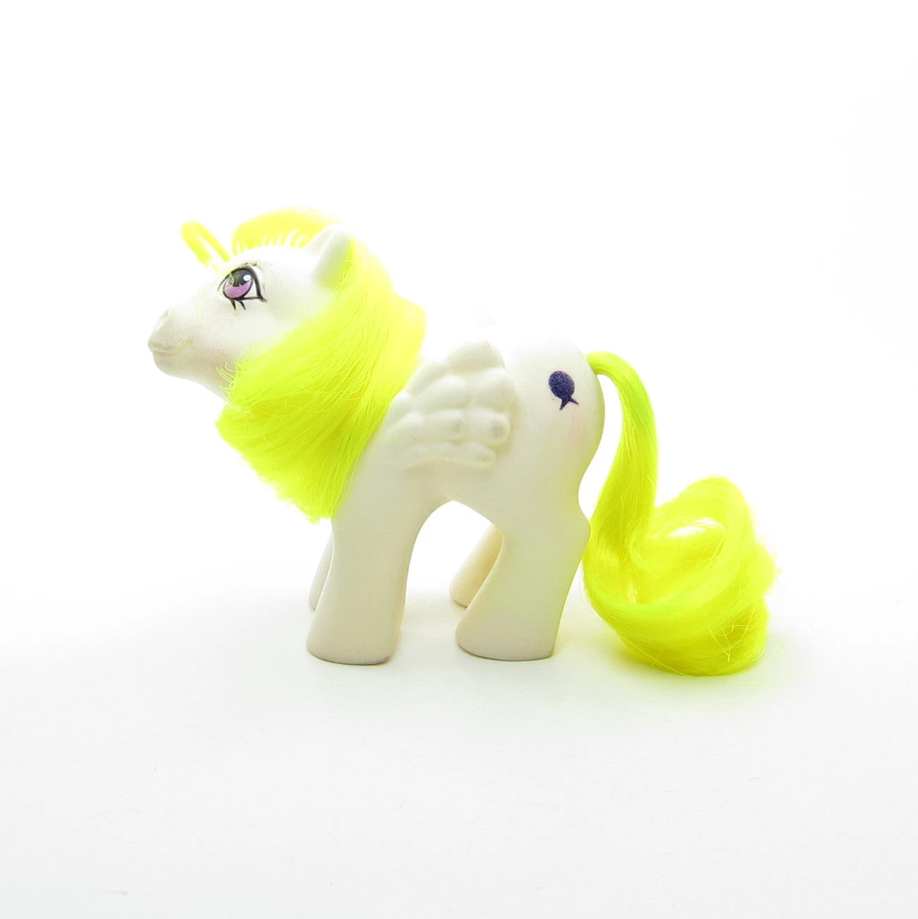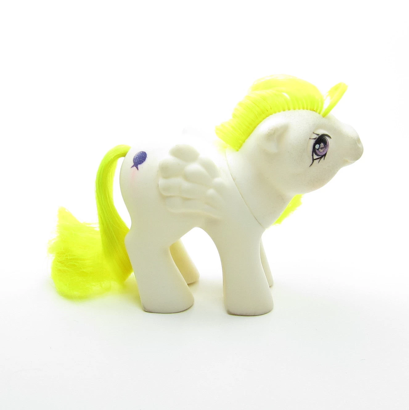 This vintage My Little Pony is Baby Surprise, she’s a white pegasus with neon yellow hair. She has purple eyes and her symbol is a glittery purple balloon with a pink string. Her head is tilted upward, which gives her a sweet and innocent expression. Baby Surprise was released in Year 3 in the first line of baby ponies.Â
