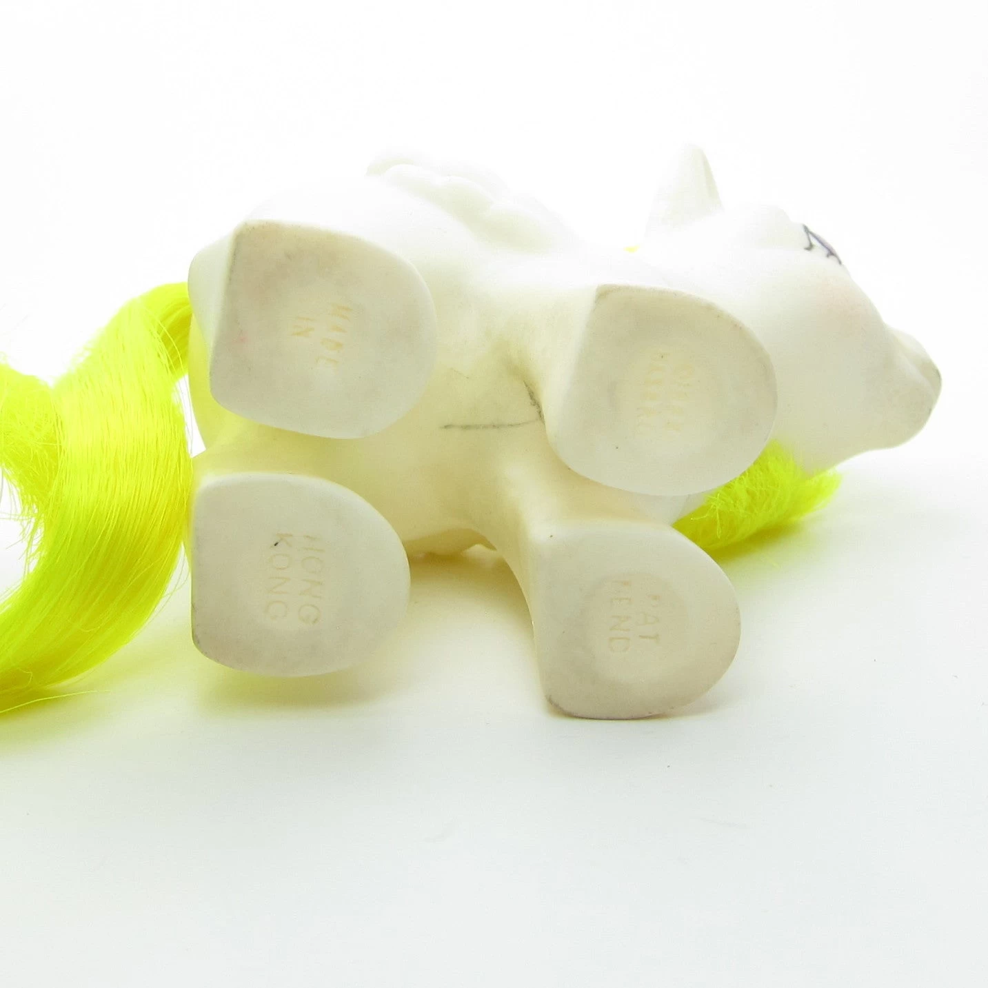 Baby Surprise’s hair is smooth and free from tangles. Her body shows some surface dirt, which is common for white ponies, but she also has little black spots in the pores of the plastic on her head, as shown in the photos. Her eye paint is scratched on her non-display side. The balloons on her symbol are in good condition, but the pink strings are faded. She also shows some dirt and a pen or pencil mark on the underside of her body.