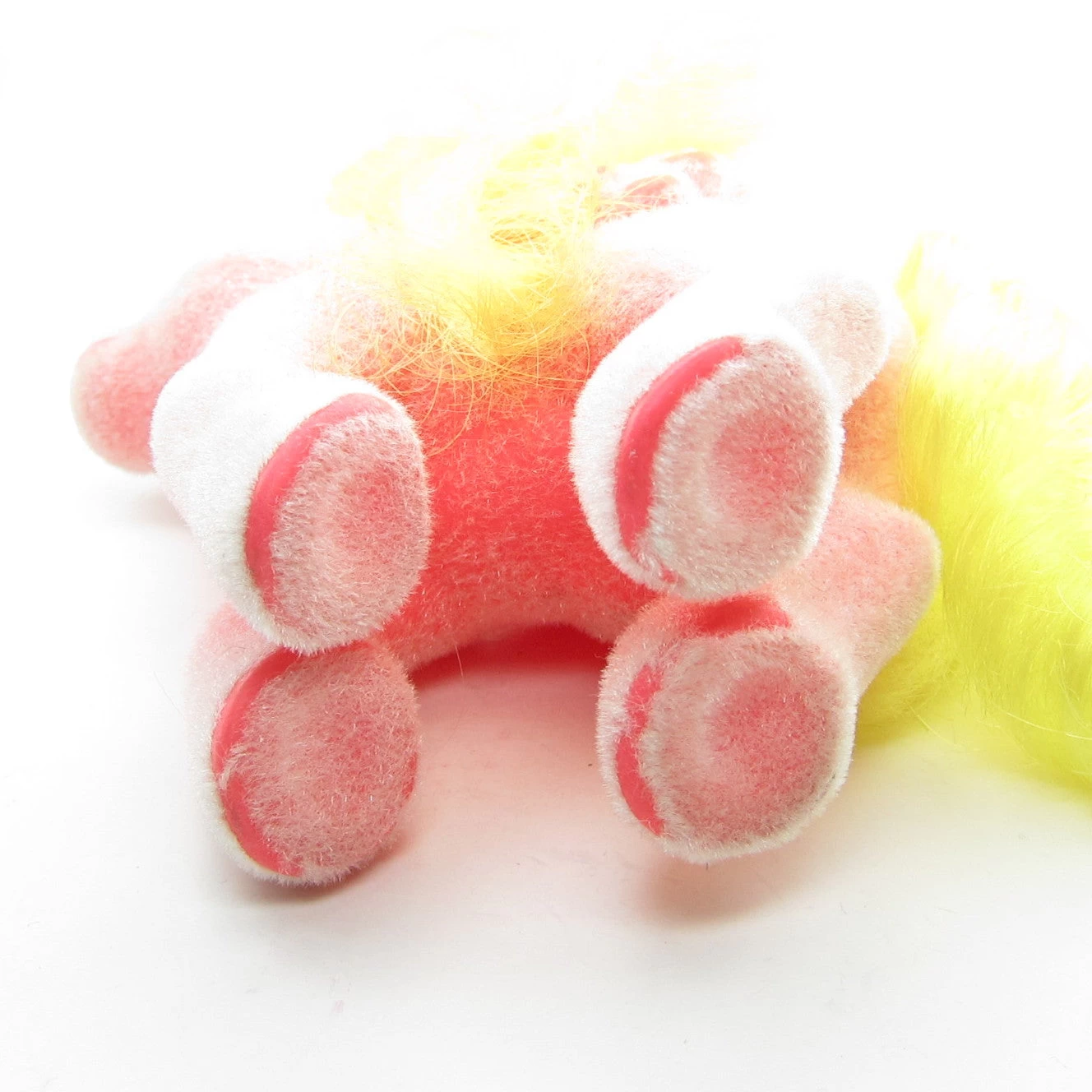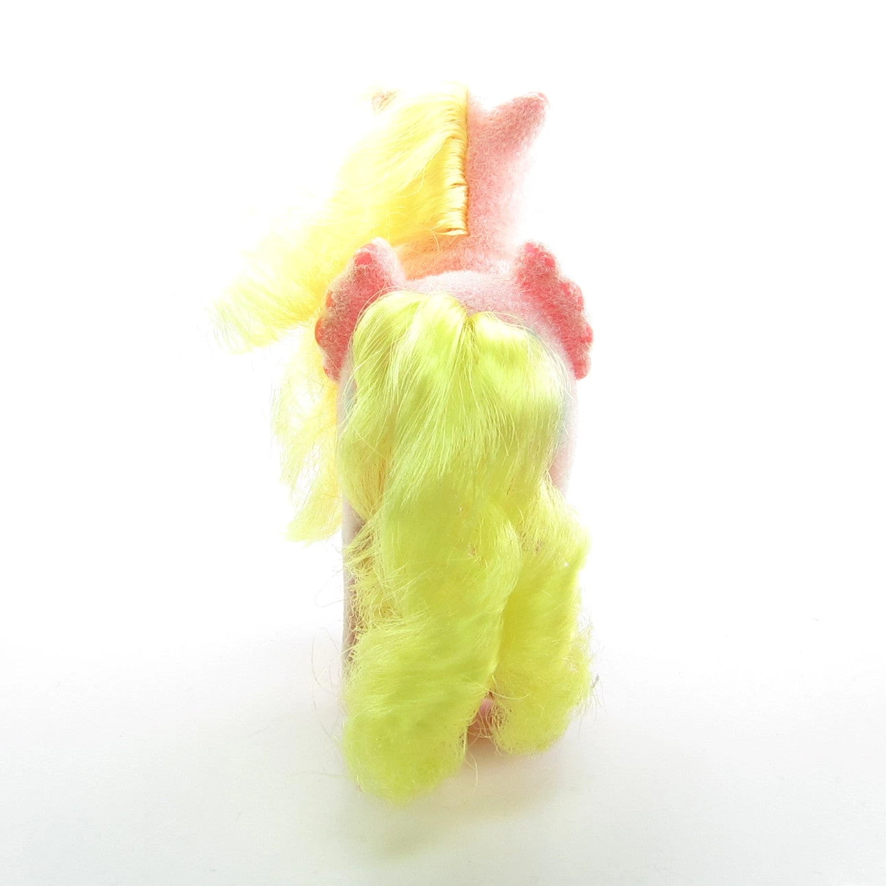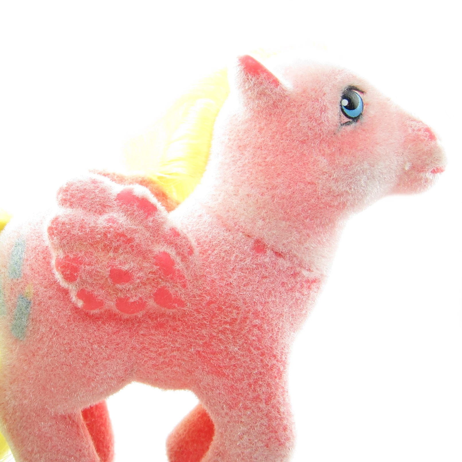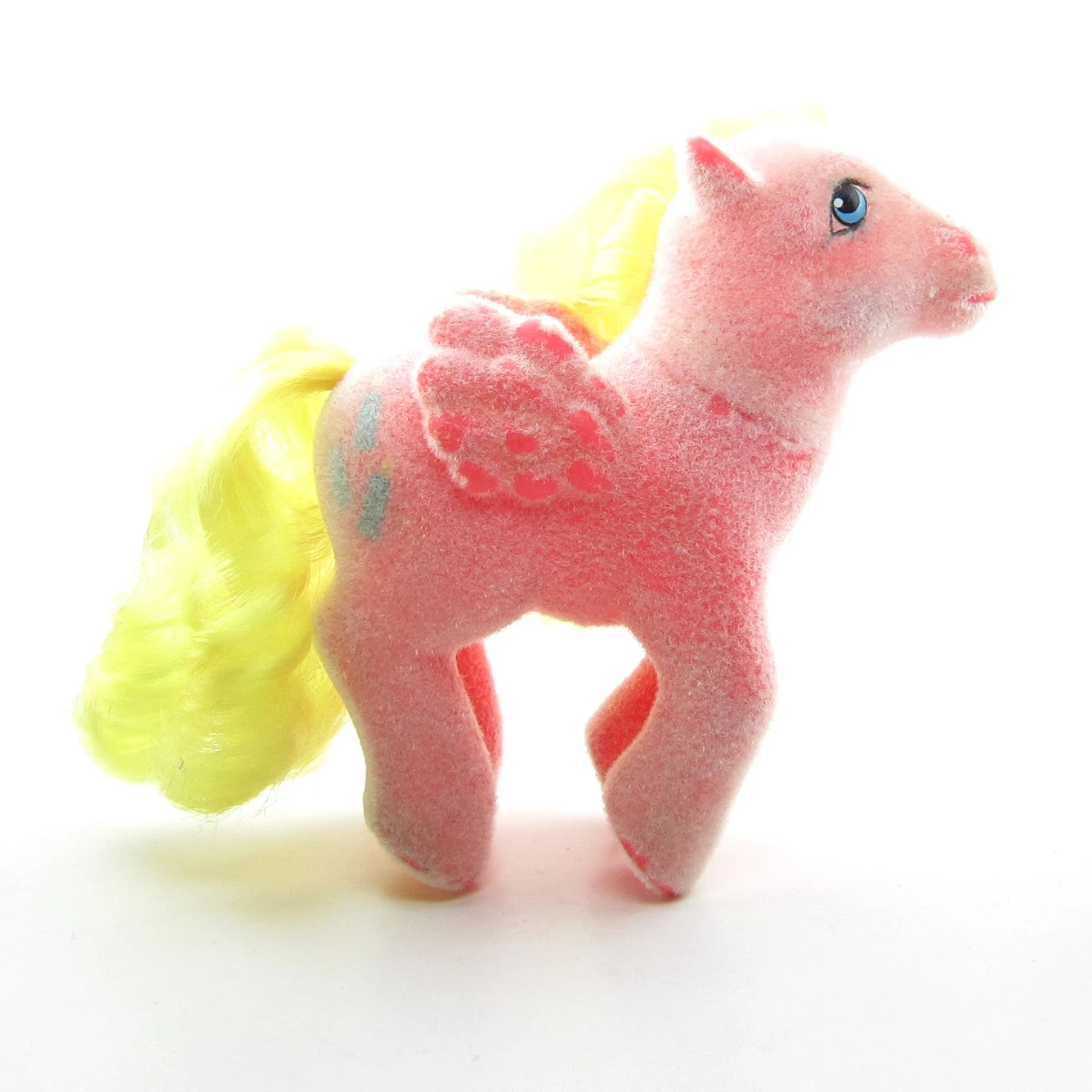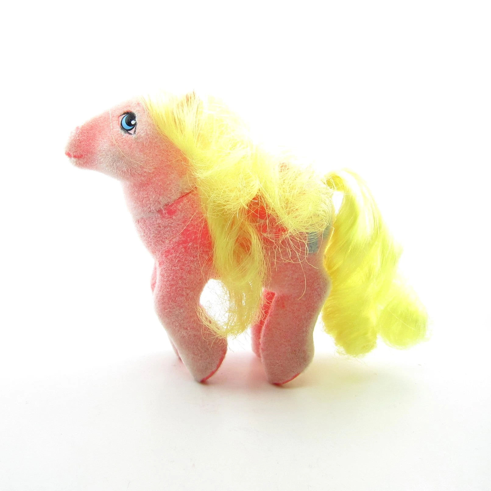 This vintage G1 My Little Pony is Best Wishes, she’s one of the So Soft Ponies from Year 4. She’s a hot pink pegasus with flocking that gives her an orange or pinkish color. She has neon yellow hair and her symbol is 3 blue birthday candles.