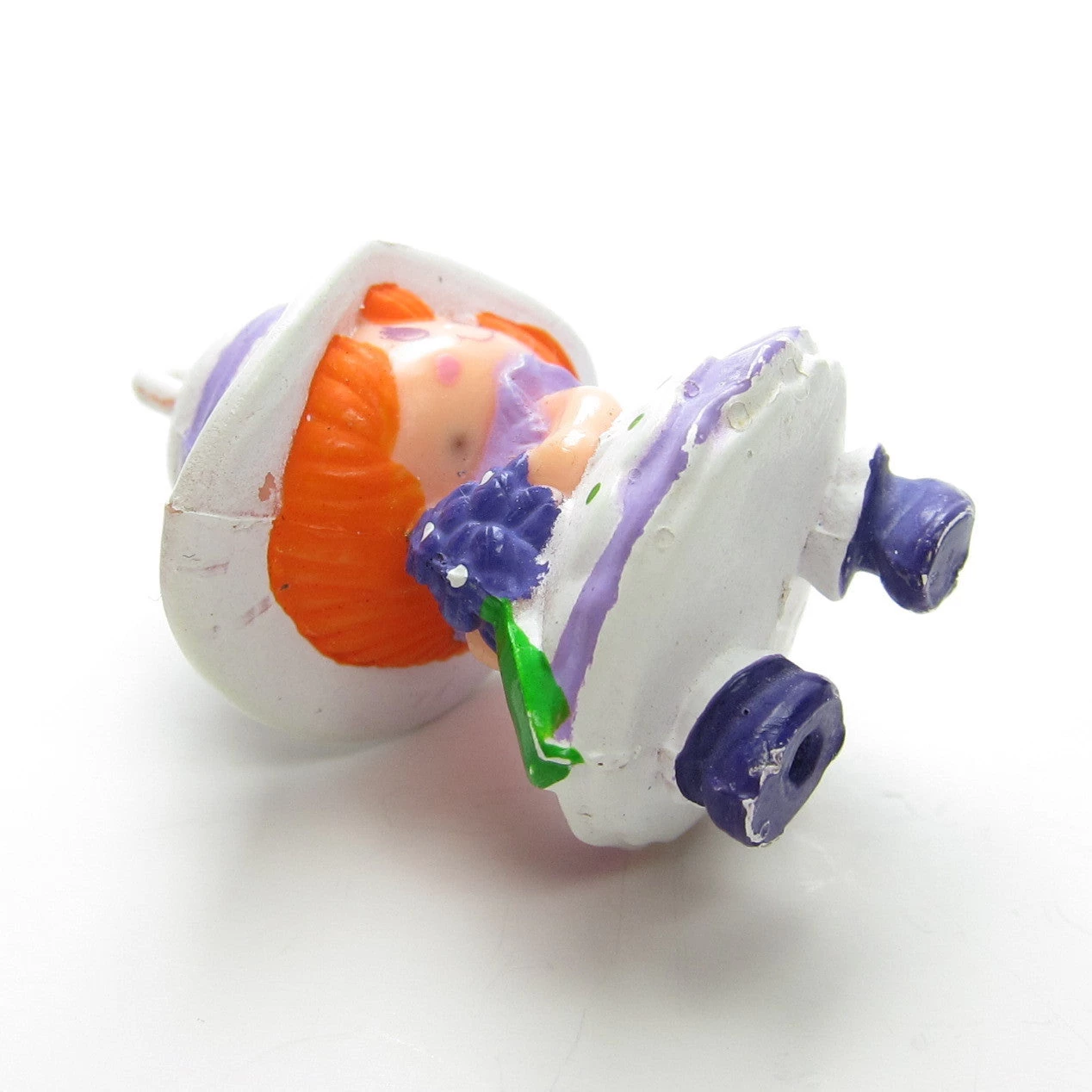 This vintage Charmkins charm is Blossom, she hangs from a white pocket clip with purple details. Blossom has orange hair and wears a purple dress and purple shoes. She’s holding a bouquet of flowers and has a purple iris on her white hat.
