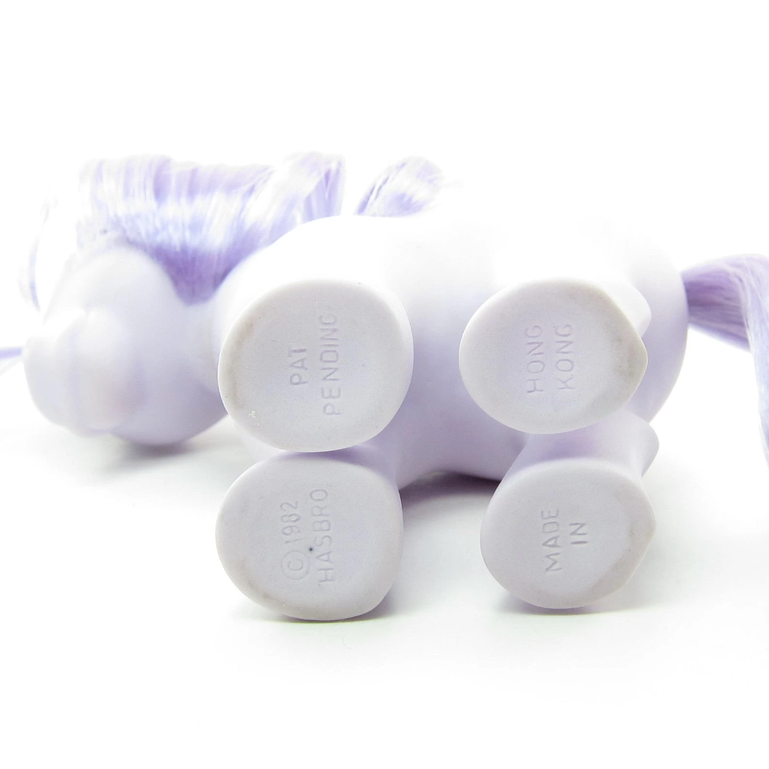 This vintage My Little Pony is Blossom, she’s lavender with white flowers as her symbol and a light purple mane and tail. She has purple eyes and is the version with concave feet.