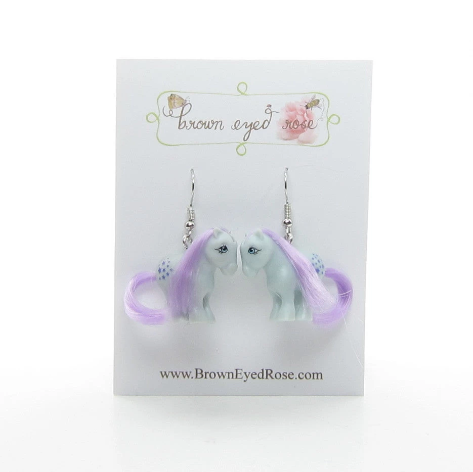 These handmade My Little Pony earrings feature miniature versions of Blue Belle on nickel-free ear wires. The earrings are made from the World’s Smallest My Little Pony toys from 2018. Each pony is just 1 inch (2.5 cm) tall!Â