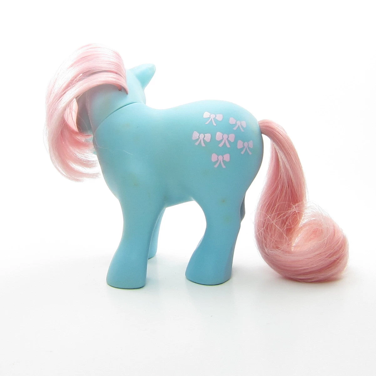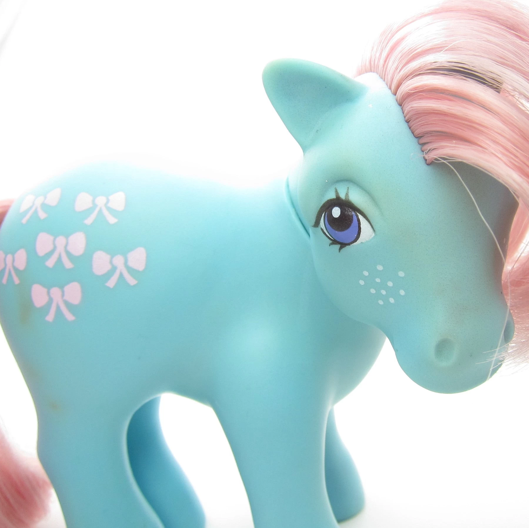 This vintage G1 My Little Pony is Bow Tie, she’s light blue with pink hair and 6 pink bows for her symbol. This version of her was released in Year 2 and has shorter hair than the Year 3 version.