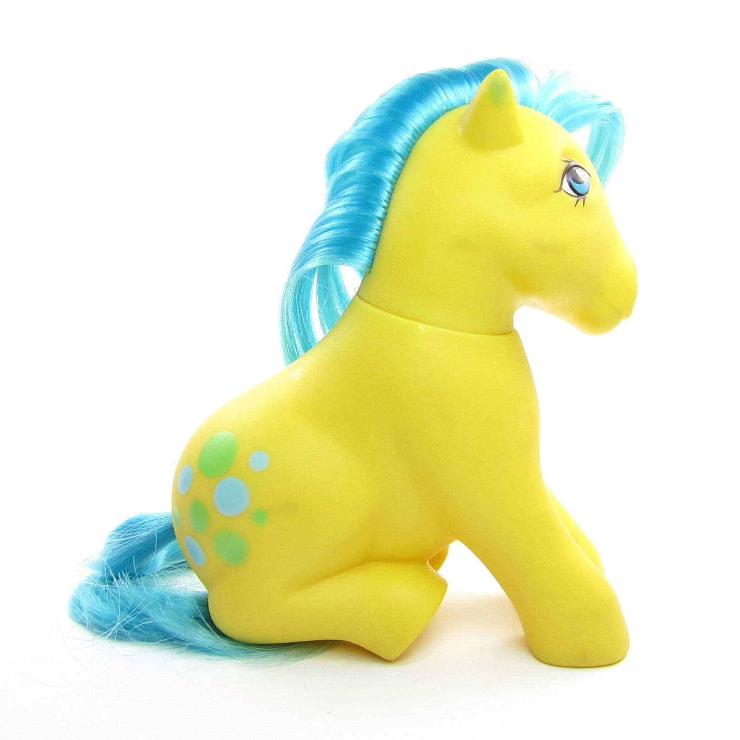 This vintage G1 My Little Pony is Bubbles, she’s one of only two ponies ever made in a sitting pose. She’s yellow with blue hair and has green and blue bubbles as her symbol. Bubbles is an earth pony from Year 2, she has blue eyes and a white diamond shape on her face.