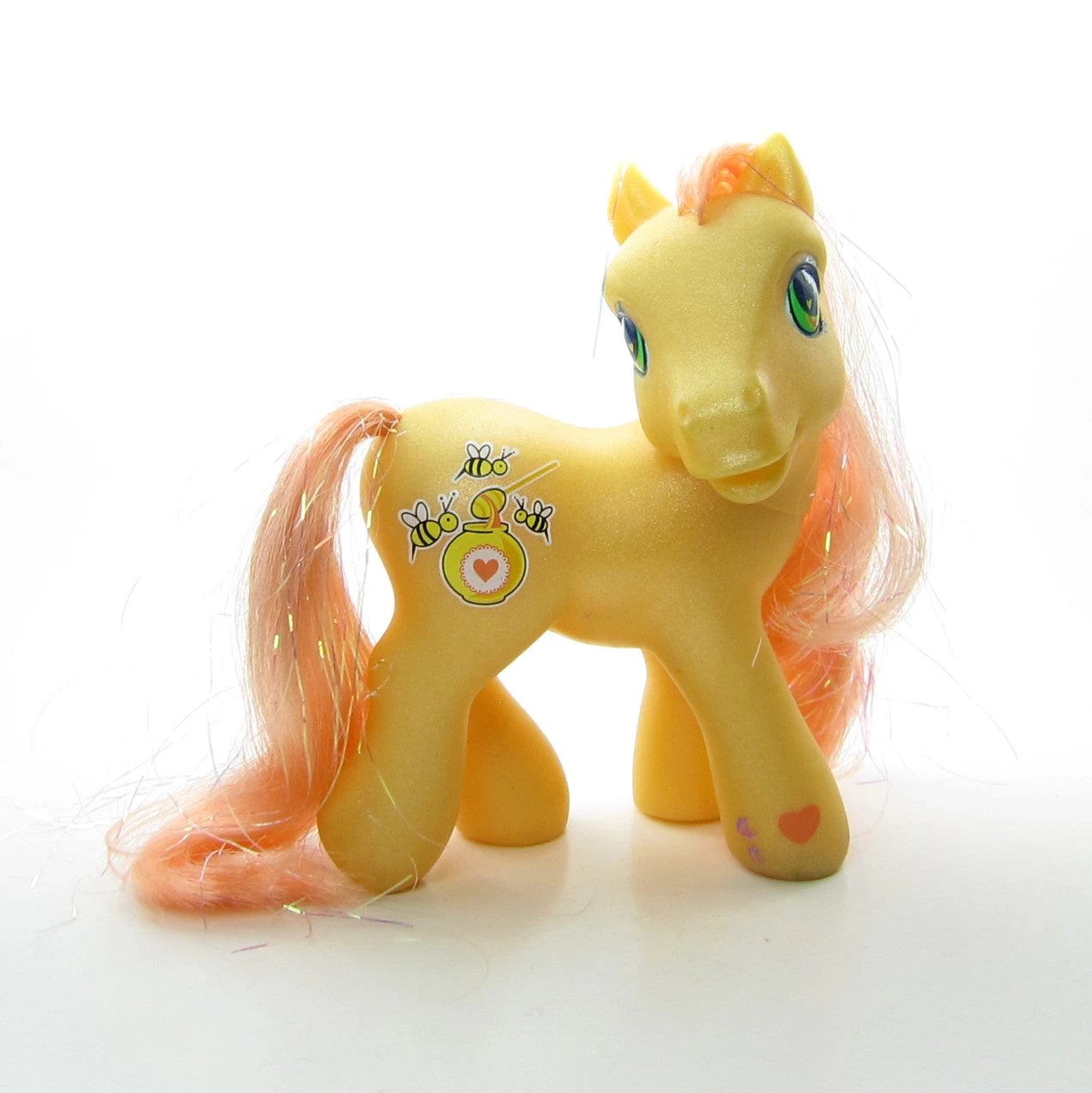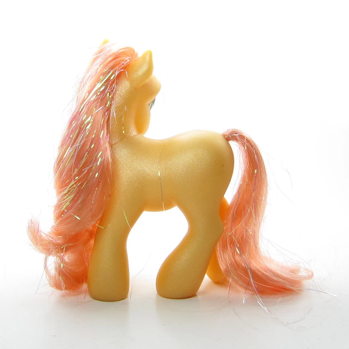 This My Little Pony is Bumblesweet, she’s one of the Glitter Celebration Ponies from Year 2 of the G3 line. Bumblesweet has a pearlescent yellow body and orange hair with iridescent tinsel. Her eyes are green, orange, and yellow with a yellow heart and her symbol is three bees flying around a honey pot. She has an orange hoof heart on her front right hoof and a magnet on the bottom of that hoof.