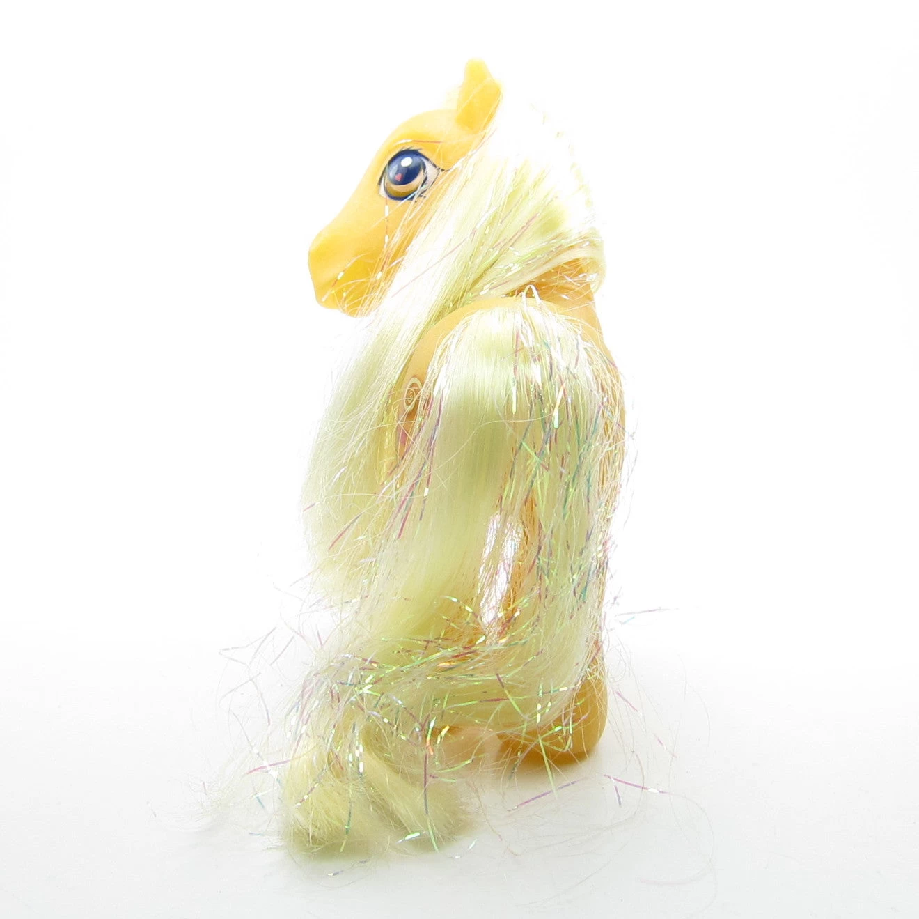 This My Little Pony is Butterscotch from Year 1 of the G3 line. She was originally sold in a promotion pack along with Sparkleworks or Minty. Butterscotch has a yellow pearlescent body and light yellow hair with iridescent tinsel. Her eyes are yellow with a pink heart and her cutie mark is two brown and yellow lollipops tied with red bows. She has a red hoof heart on her front right hoof and a magnet on the bottom of that hoof.