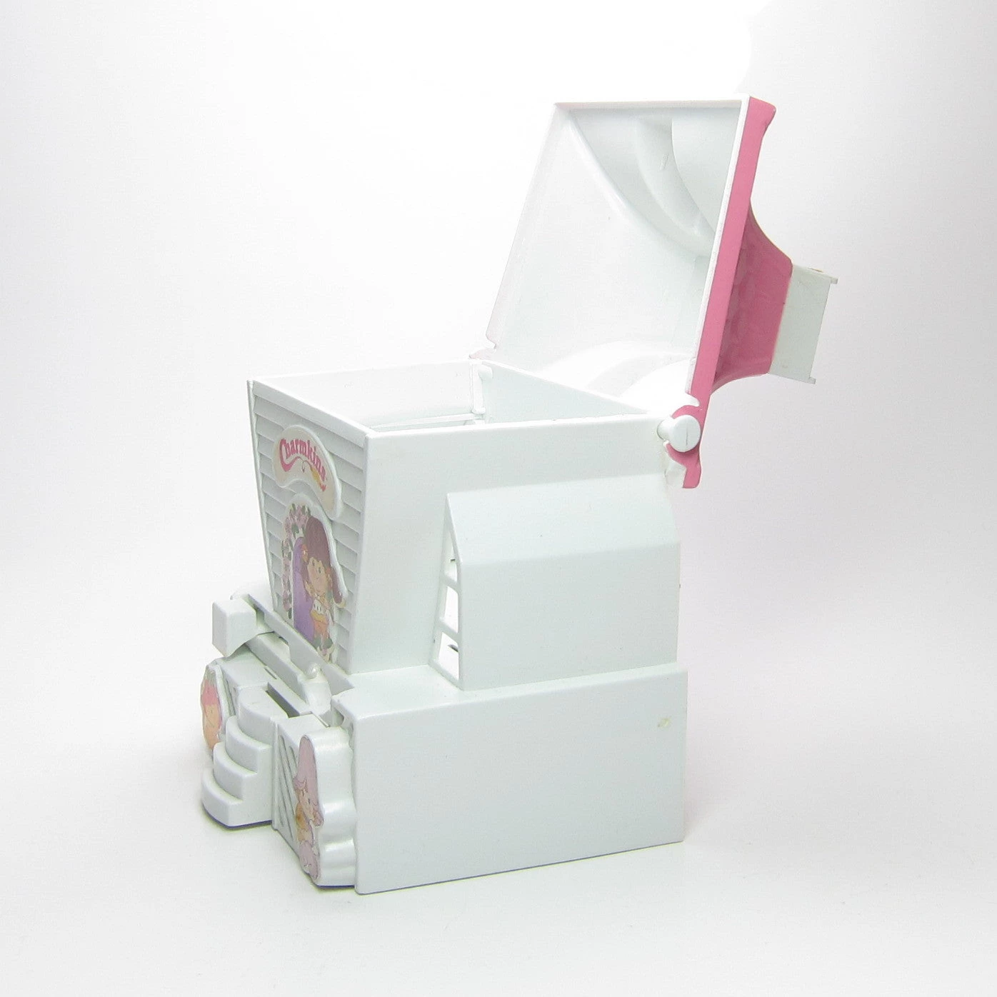 This vintage Charmkins house is a miniature gumball machine or candy dispenser. The front has a slot where you can insert a penny, then a lever slides to deposit the penny in a lower compartment. The gumball will come out of a hole underneath the front steps – just lift the steps to get the gumball.