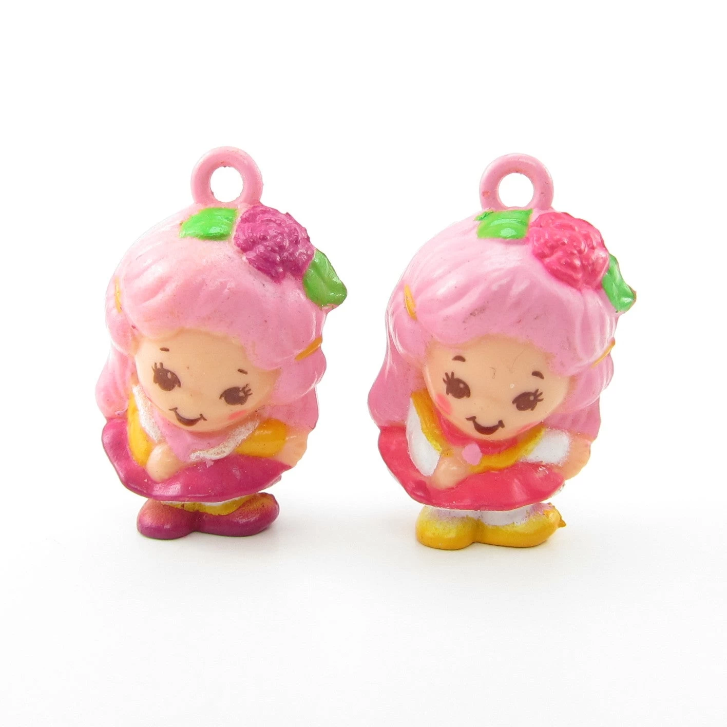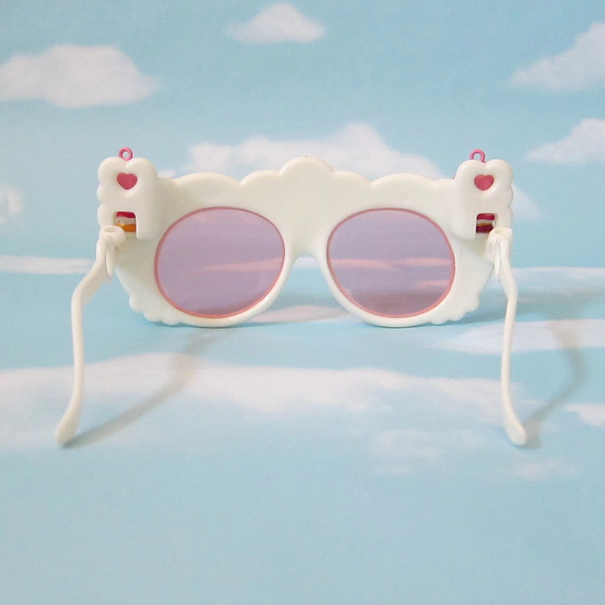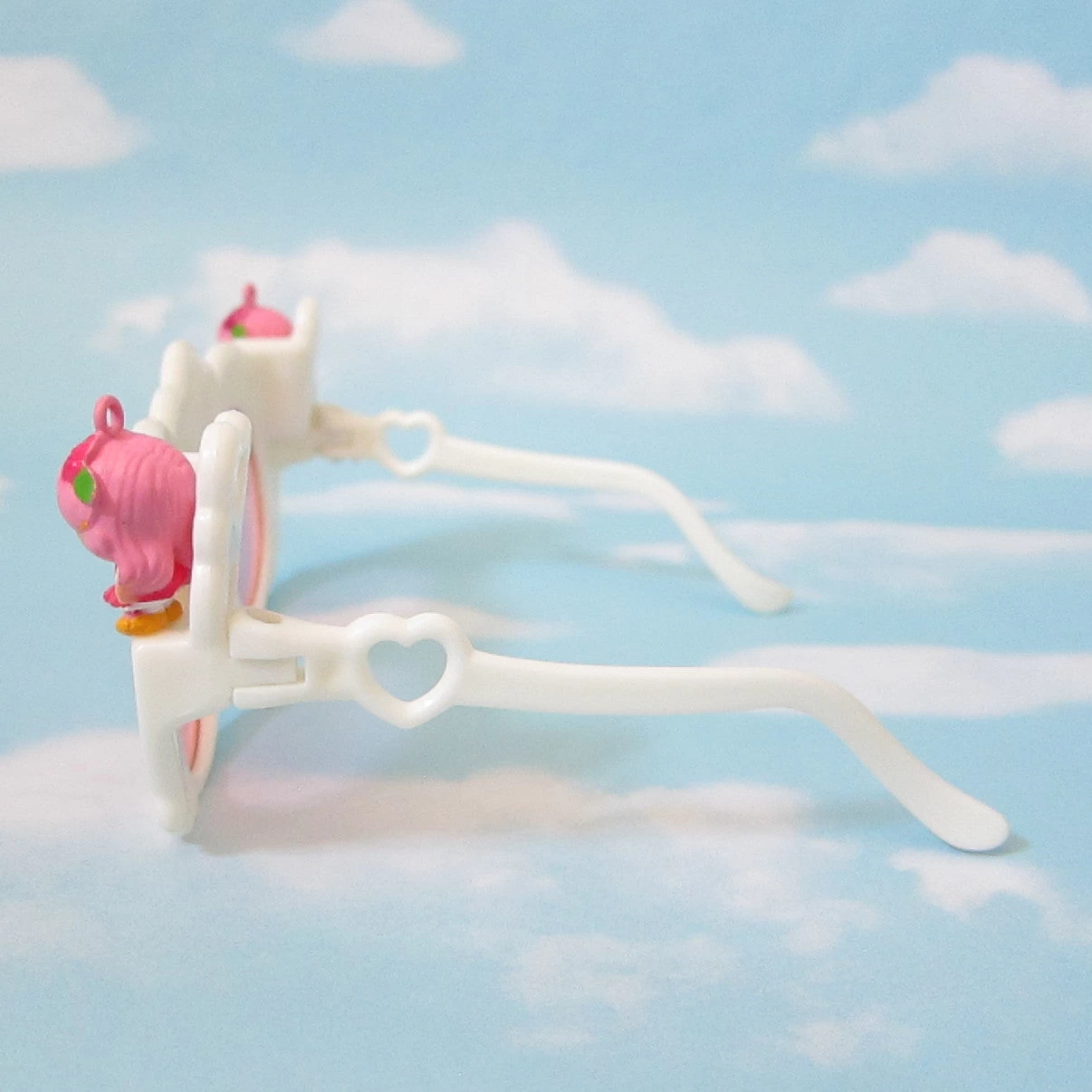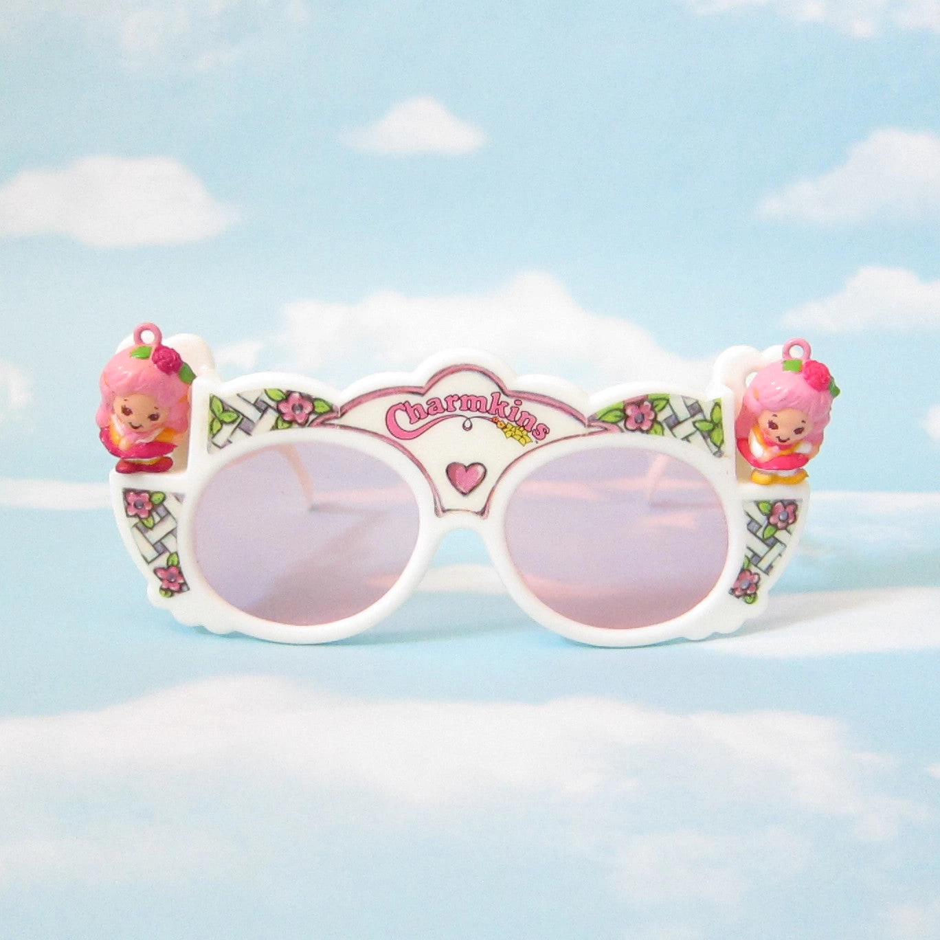 These vintage Charmkins sunglasses have pink lenses and come with the Honey Bunch and Sunny Bunch charms. The sunglasses are made of white plastic and have the Charmkins logo in the middle and a lattice pattern with pink flowers. There are pegs on both sides of the sunglasses where Honey Bunch and Sunny Bunch can stand.