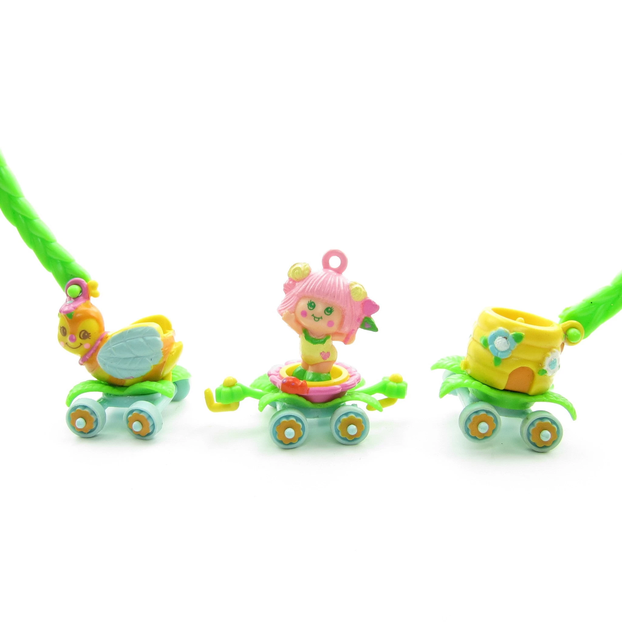 This vintage Charmkins jewelry is the Honey Bee necklace. The set includes five separate pieces: a necklace, Sweet Bea Charmkins charm, and three “train” pieces (one with Honey Bee, one with a beehive, and one with a flower). The links on the train pieces are broken, so they can no longer link together as a set.