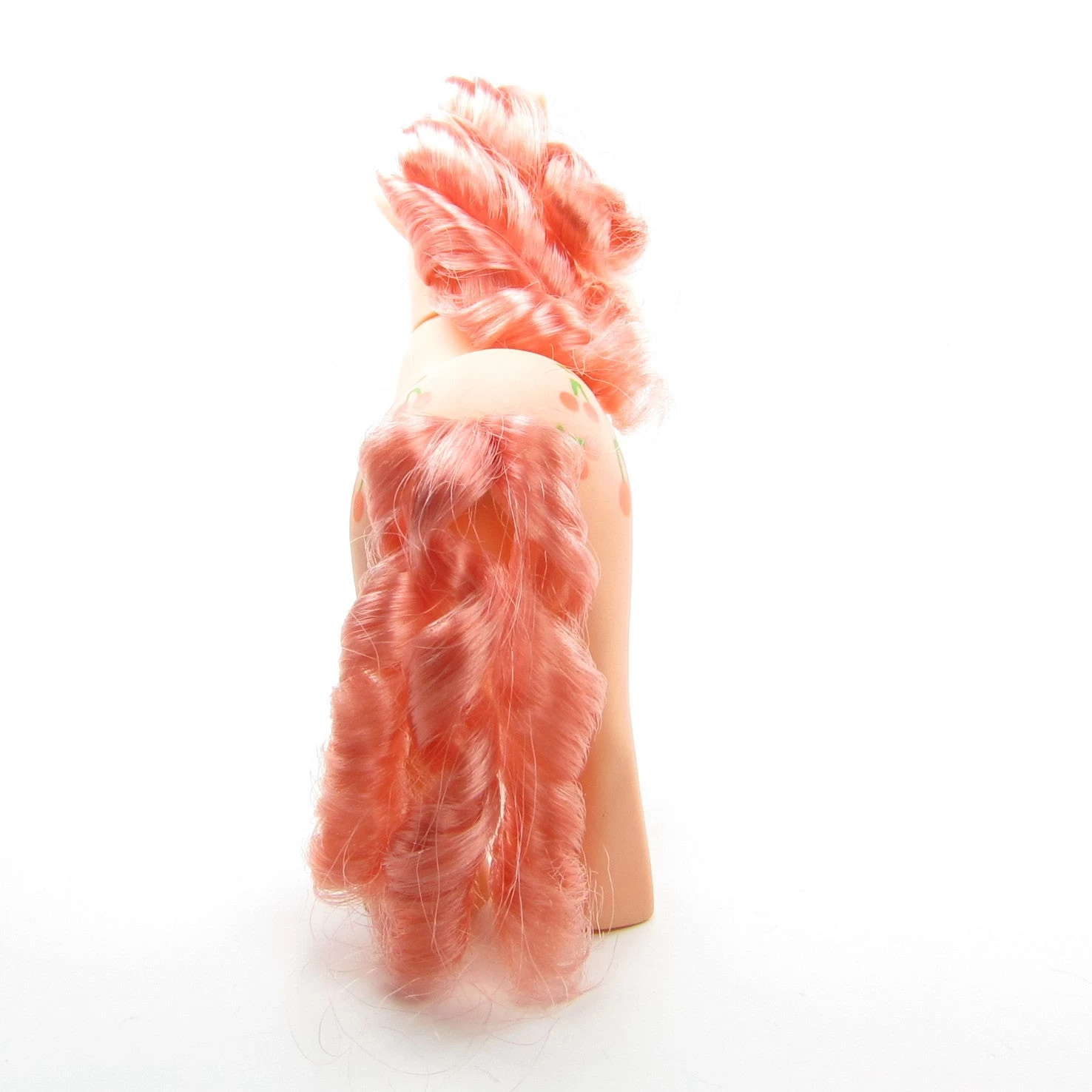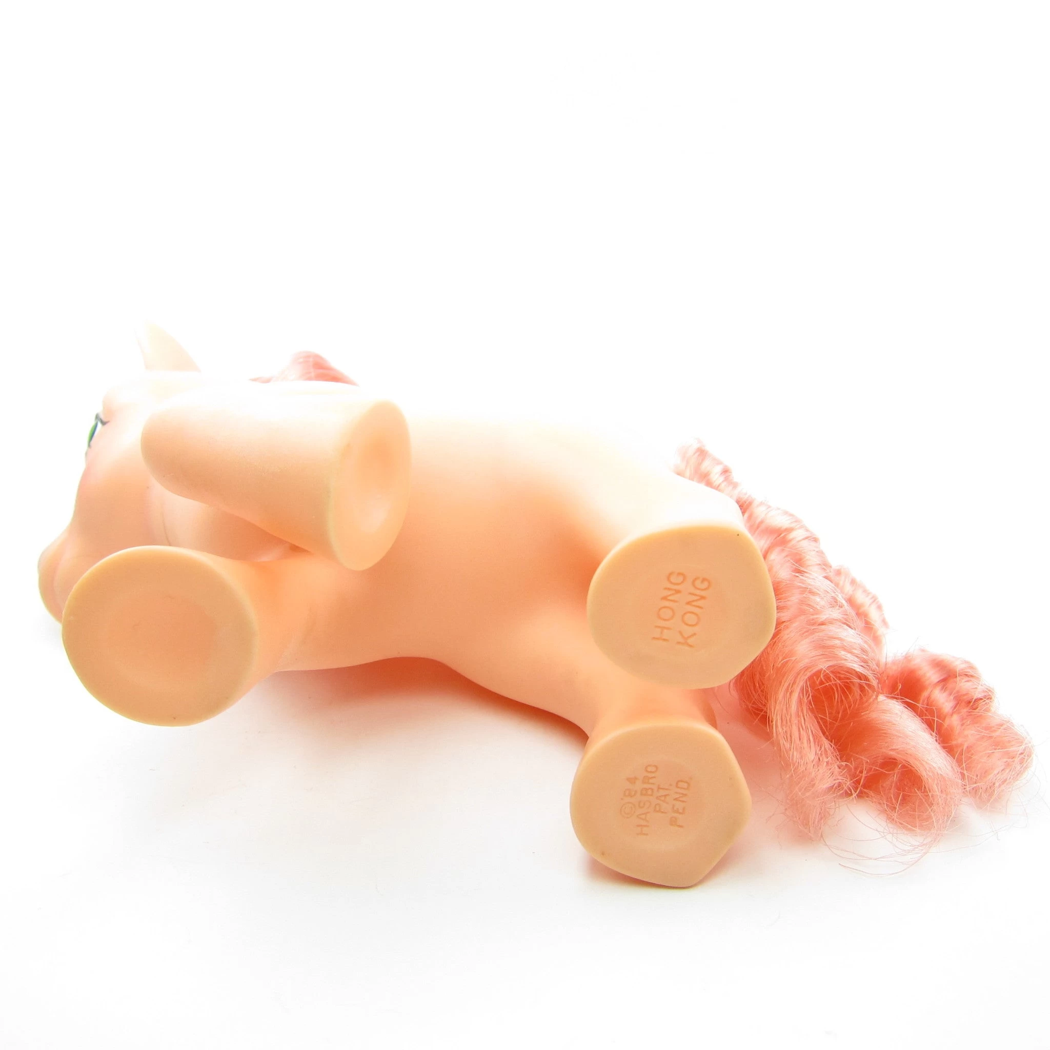 This vintage G1 My Little Pony is Cherries Jubilee, she’s a pink pony that was released in Year 3 of the My Little Pony line. Her hair is a lovely pink or light red color and she has green eyes. Her symbol is five cherries with green stems.Â