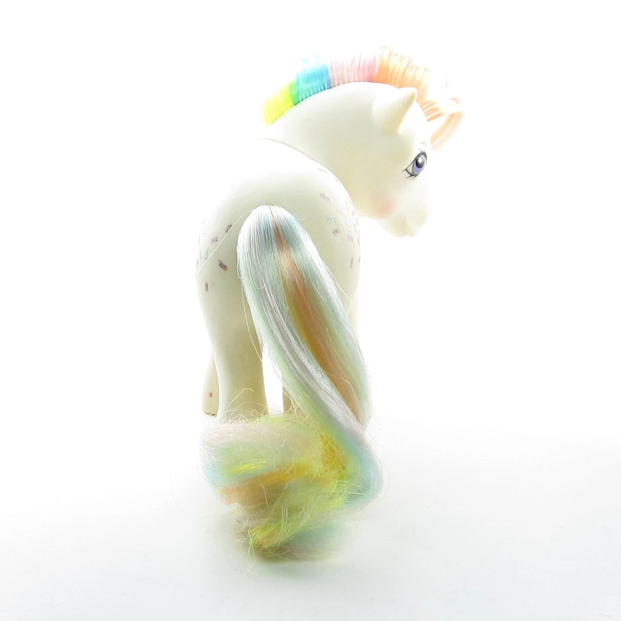 This vintage G1 My Little Pony is Confetti, she’s a white Rainbow Pony with purple eyes. Her hair is rainbow colored and she has glittery purple and blue confetti for her symbol. This is the rare European or UK variant in the shy Bow Tie pose. Variants of Confetti released in the US were in the Posey pose.