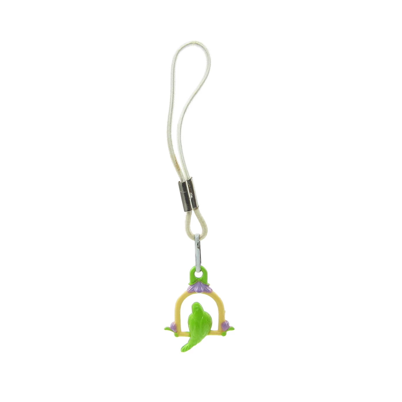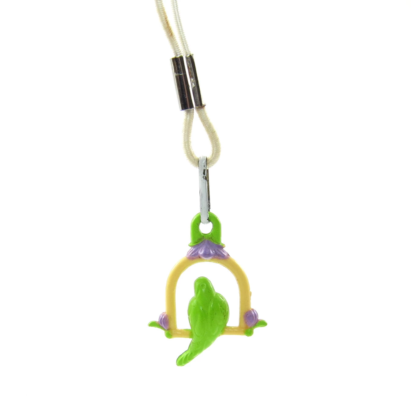 This vintage Charmkins charm is Crocus, she’s a parrot hanging on a swing and there are purple crocus flowers on each side of the swing. She hangs from a white elastic hair band with a clip at the end.