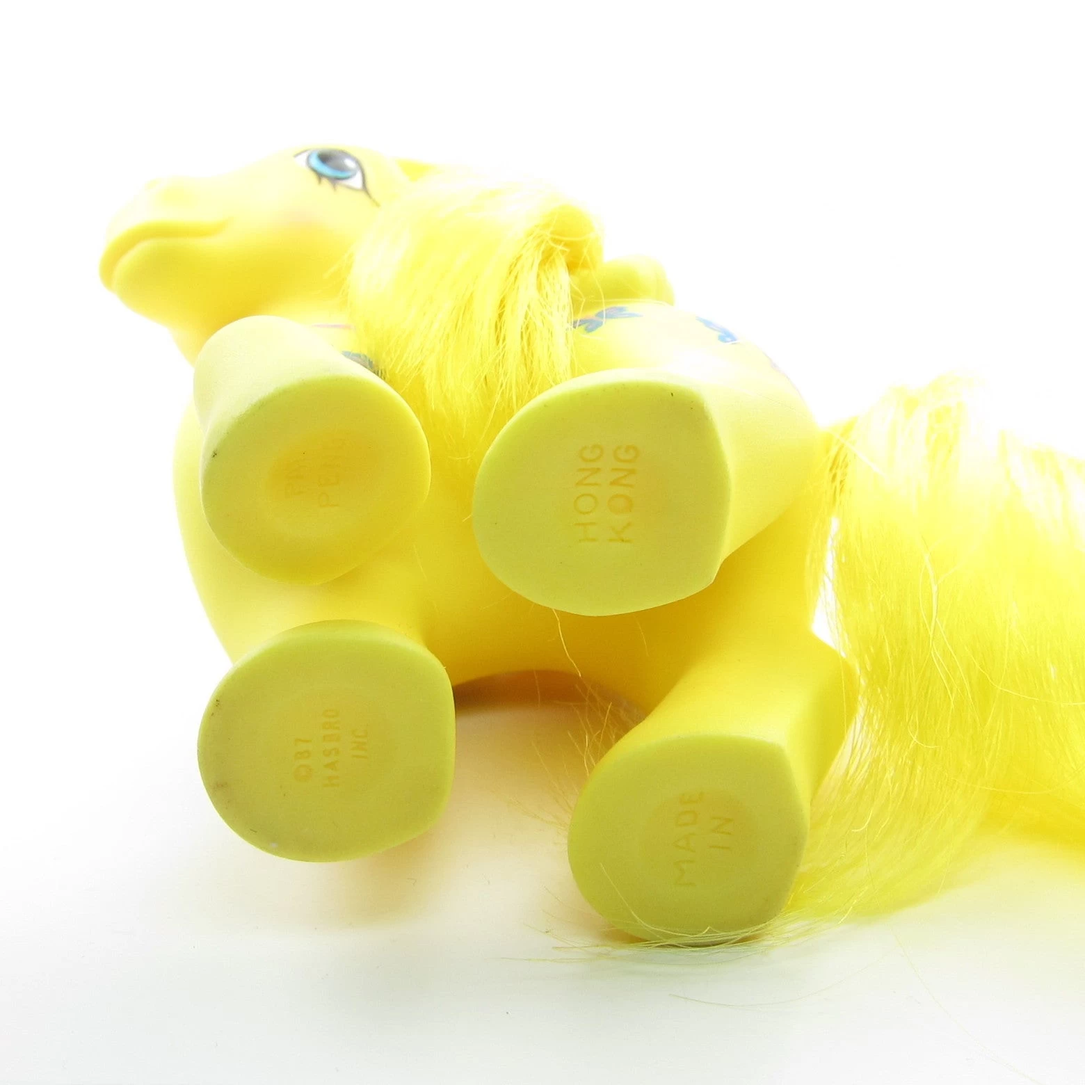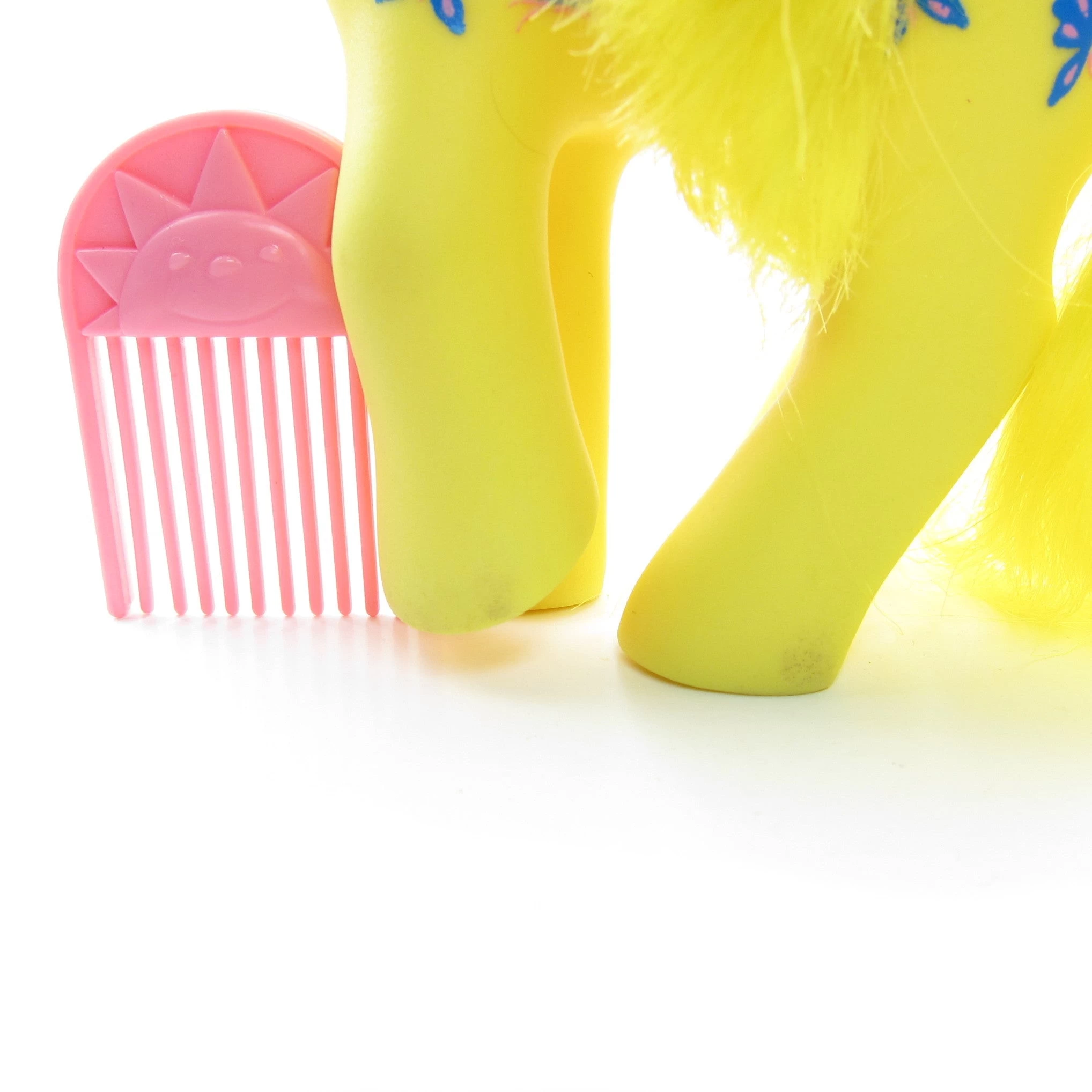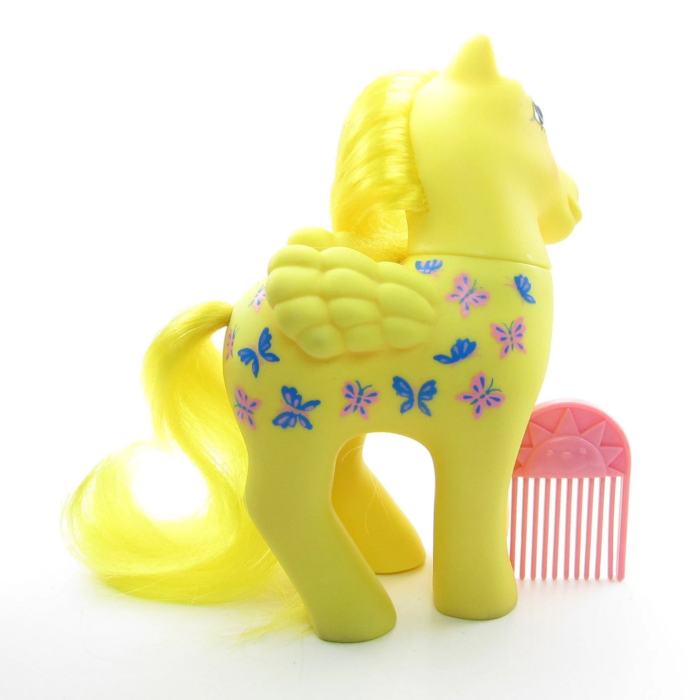 This vintage G1 My Little Pony is Dancing Butterflies, she’s a yellow pegasus with yellow hair and blue eyes. Her symbol is pink and blue butterflies.