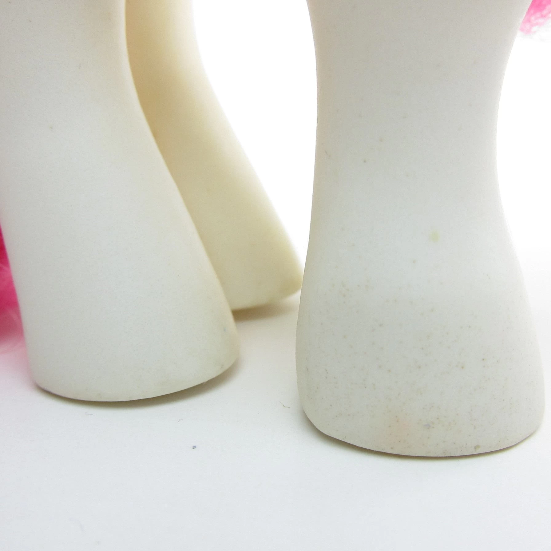 Violet’s hair is smooth and free of tangles. Her body has yellowed a little with age and shows some dirt and scuffs, which is common for white ponies. She has some tiny brown dots on her legs and feet and some marker writing on the bottom of one foot, as shown in the photos.