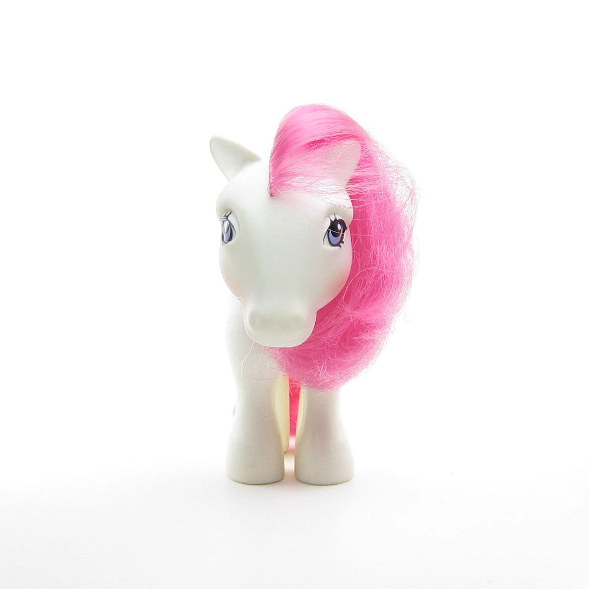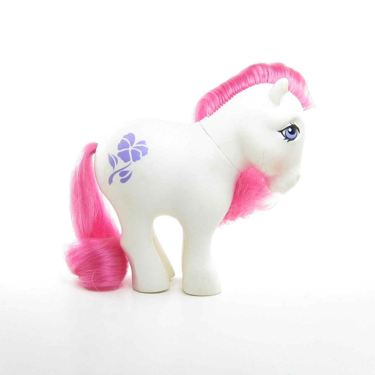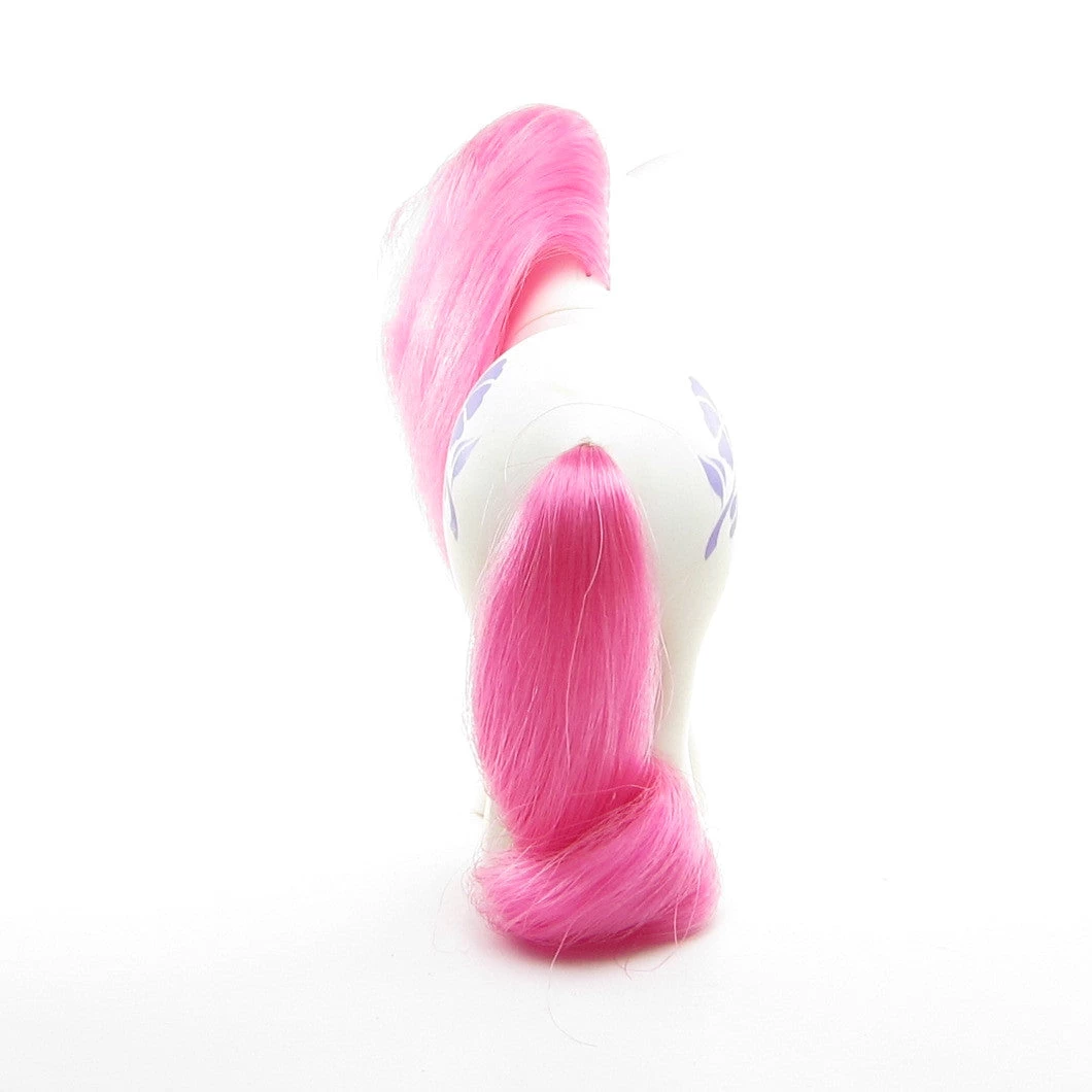 This vintage My Little Pony is Violet, she’s the Birthflower Pony for the month of February. She’s a white Earth pony with a bright pink mane and tail and purple eyes. Her symbol is a purple violet, February’s birth flower.