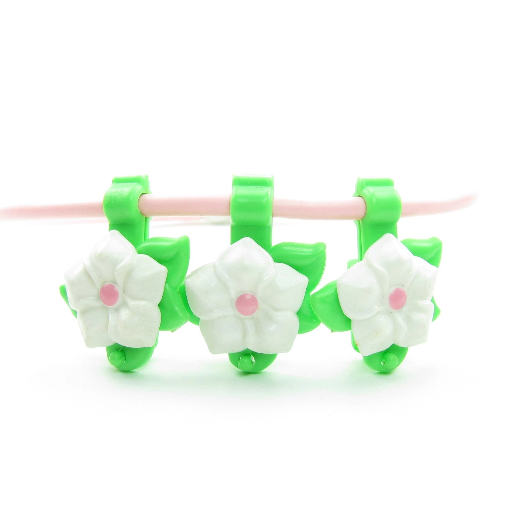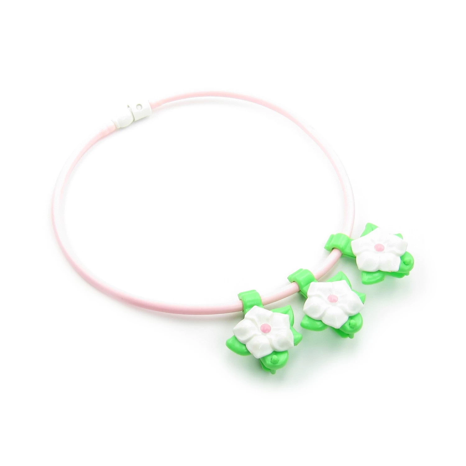This vintage Charmkins flower necklace has three hanging flowers with little pegs where you can display your Charmkins charms. The necklace is made of pink tubing and the flowers are white with pink centers and green leaves.