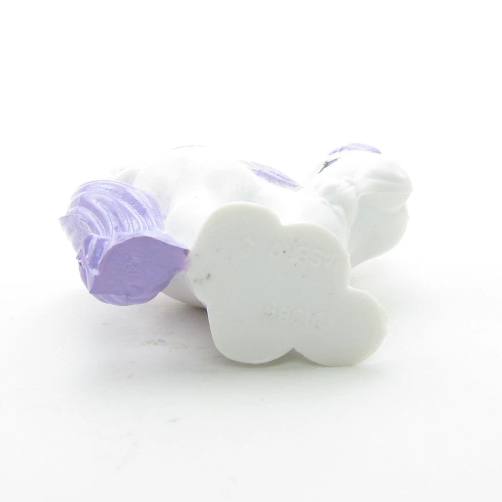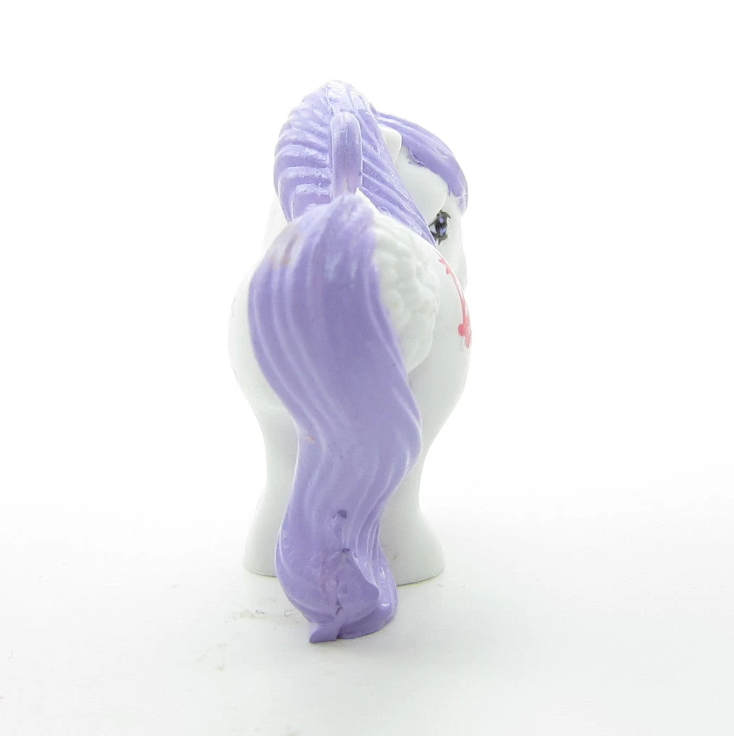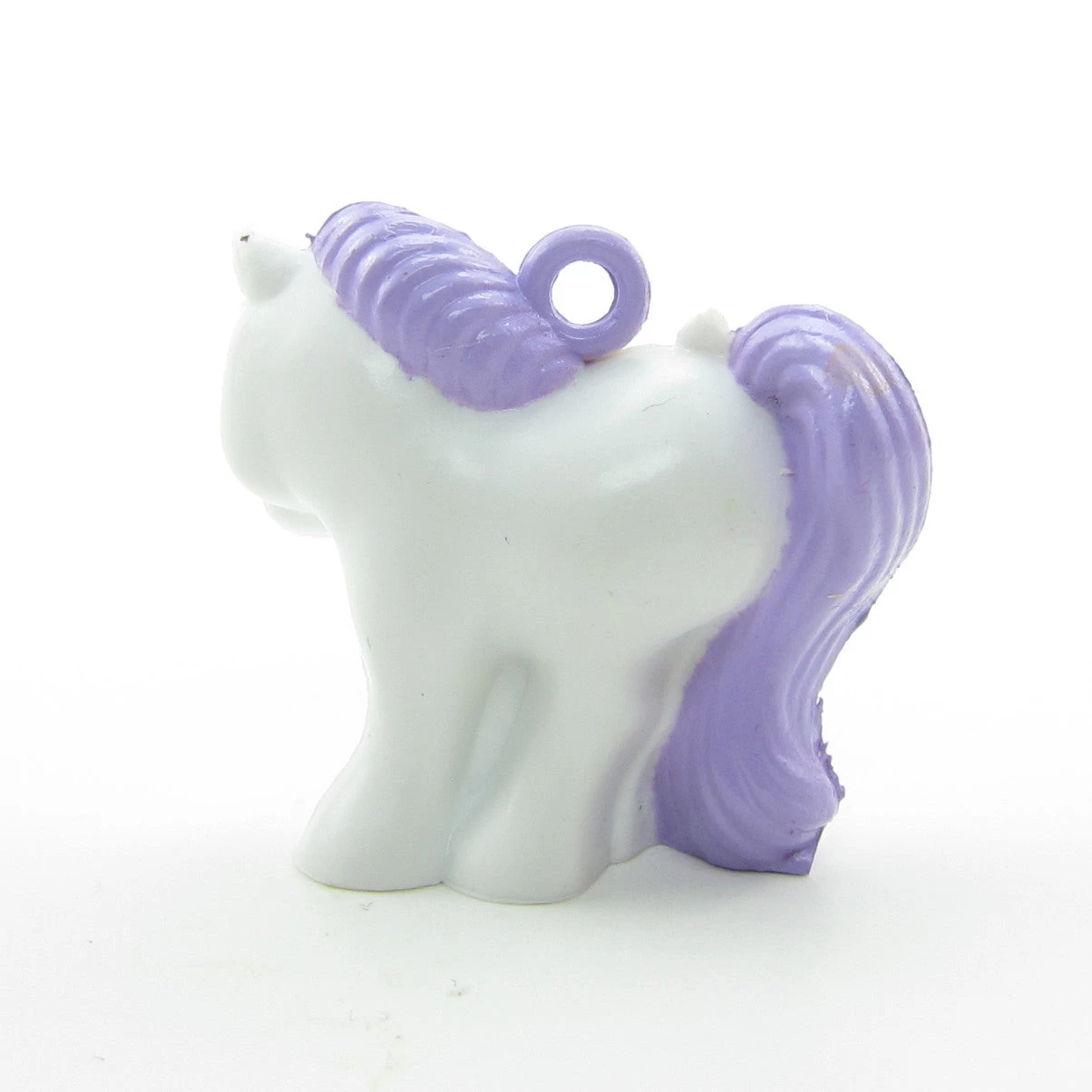 This vintage G1 My Little Pony mommy or mummy charm is Fun Lover. She’s white with purple hair and a dark pink party hat for her symbol.
