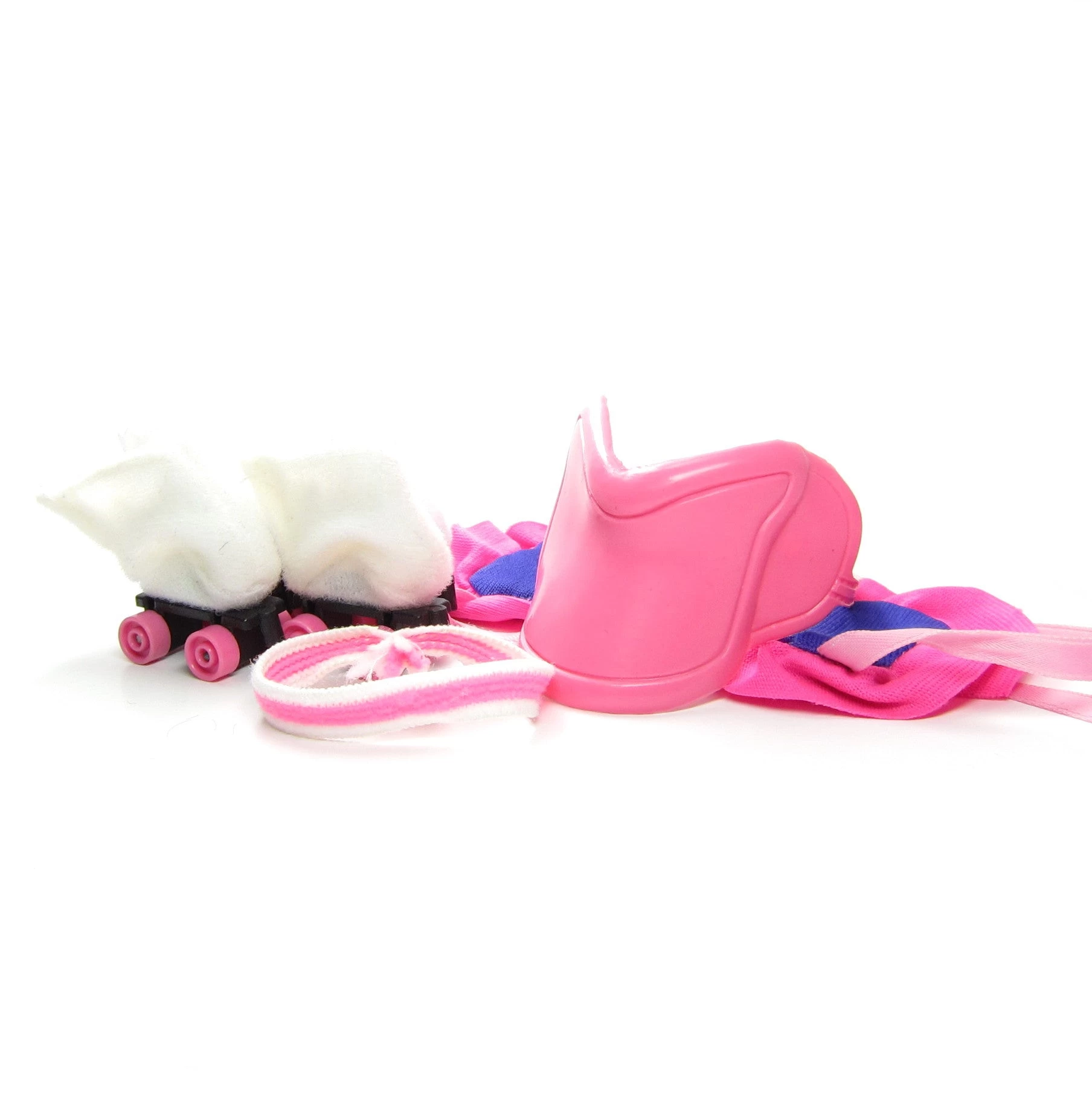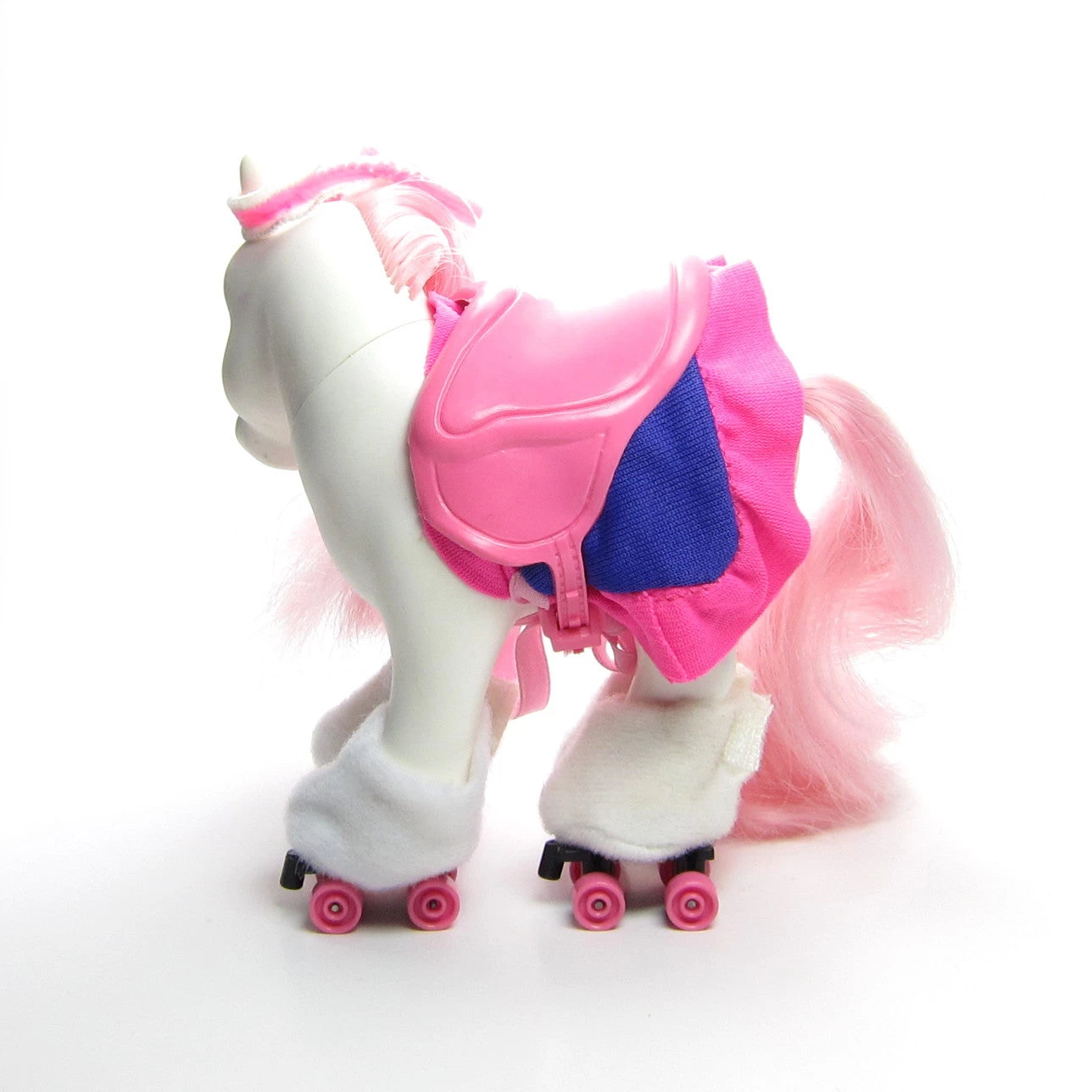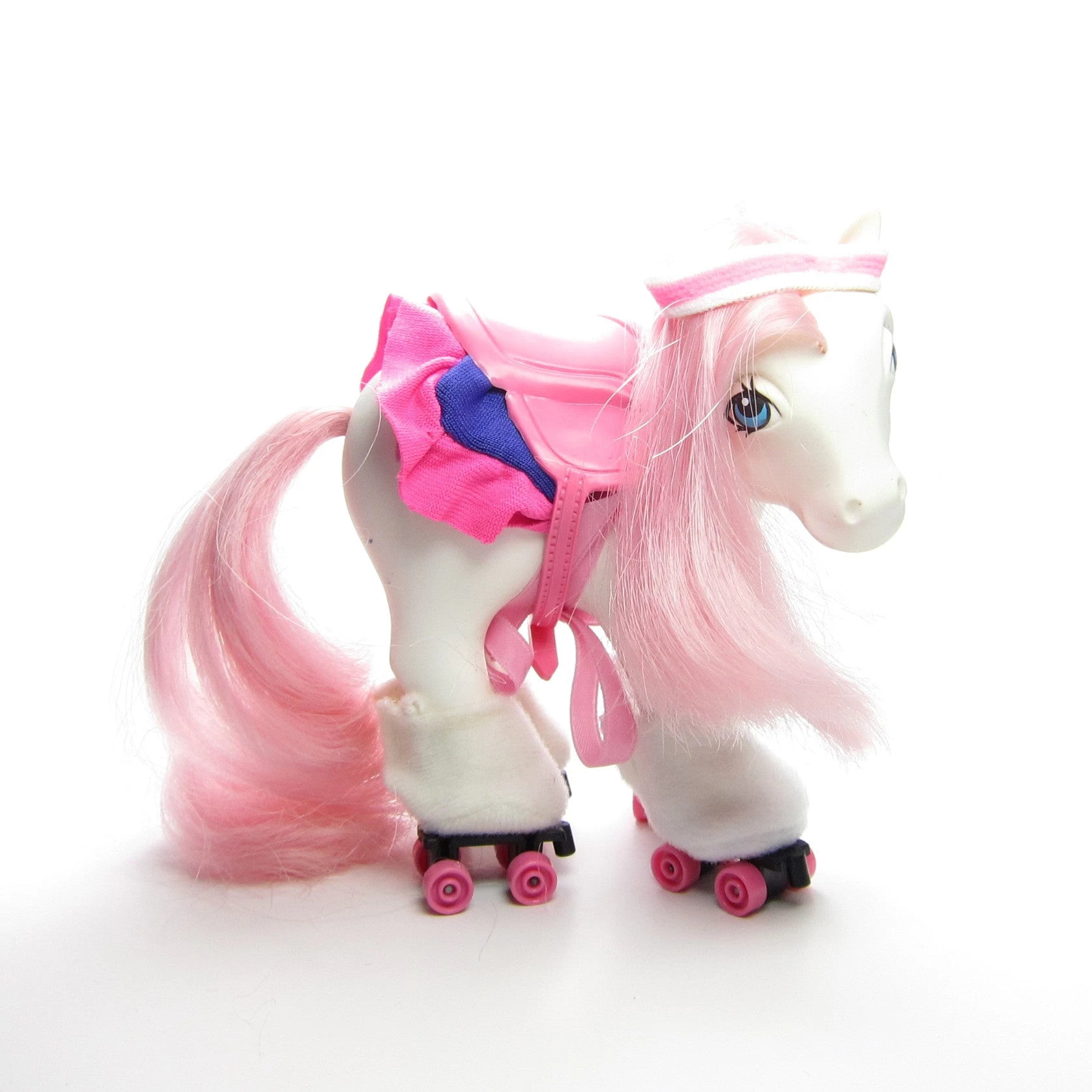 This vintage G1 My Little Pony outfit is the Great Skates Pony Wear set. It includes white roller skates with pink wheels, a ruffly pink and purple blanket, a pink plastic saddle, and a pink and white elastic headband.