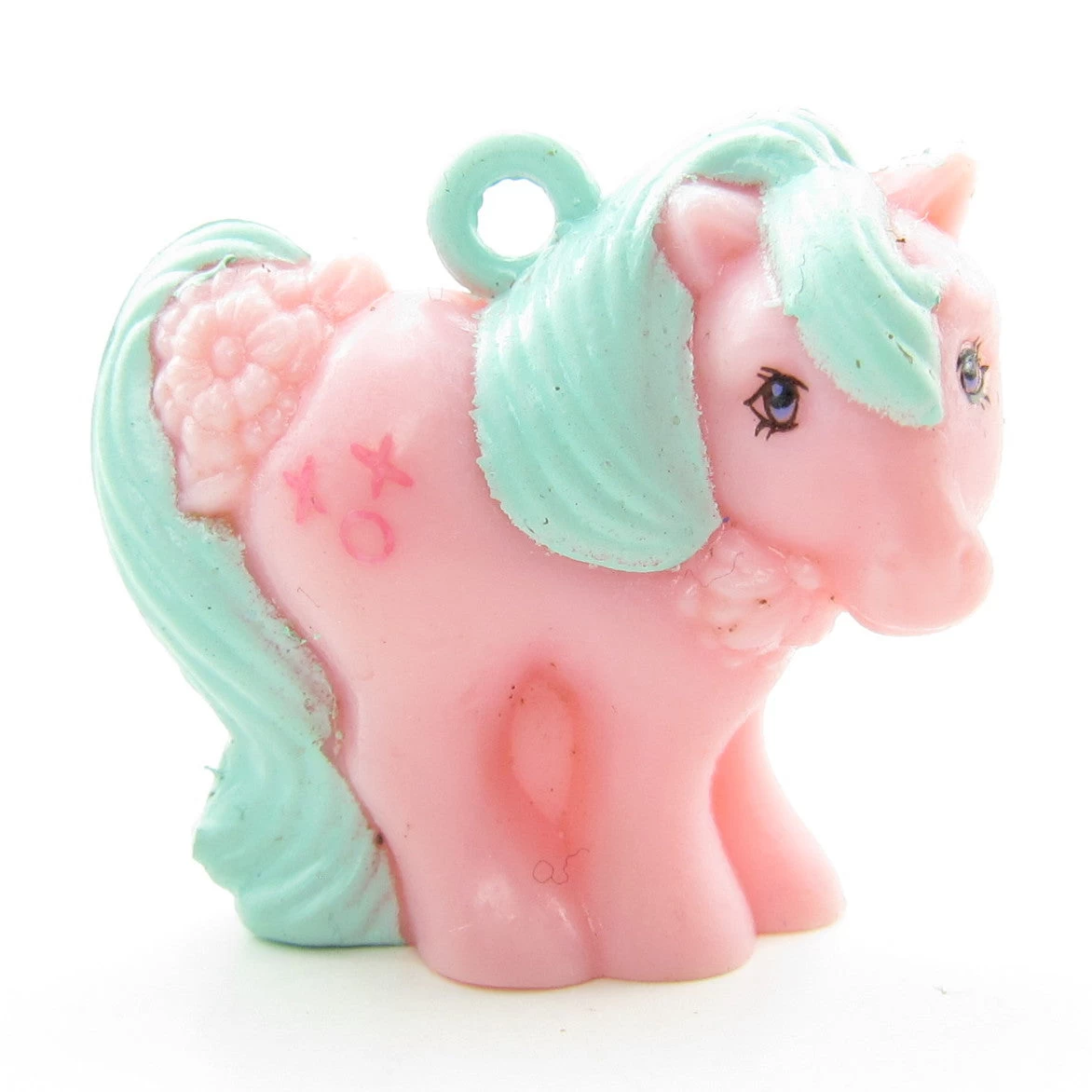This vintage G1 My Little Pony mommy or mummy charm is Hugs & Kisses. She’s pink with aqua blue hair and dark pink Xs and Os for her symbol.