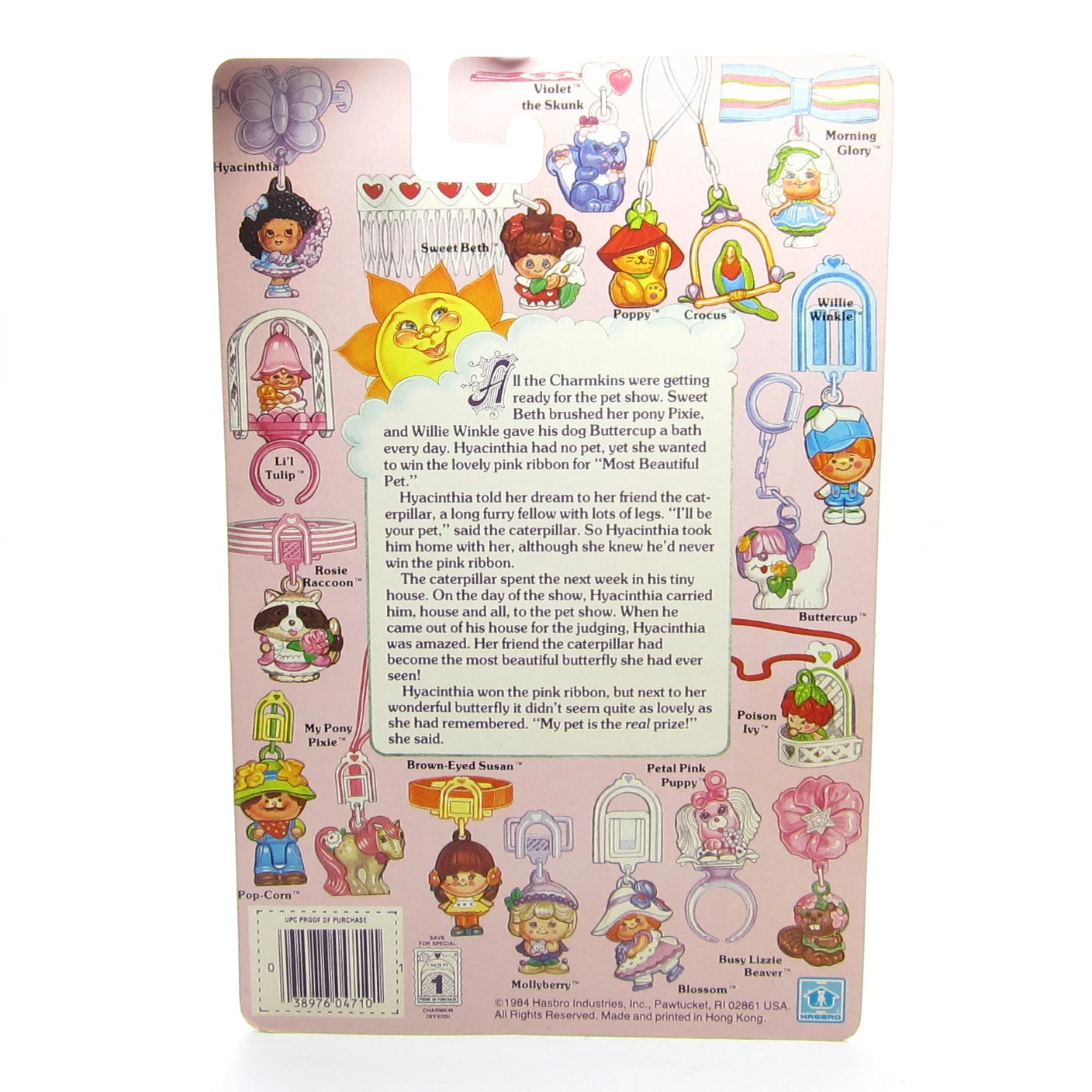 This vintage Charmkins Hyacinthia charm is still factory sealed in its plastic blister pack on the original backcard. Hyacinthia hangs from a purple butterfly barrette that fastens to a blue elastic ponytail holder.
