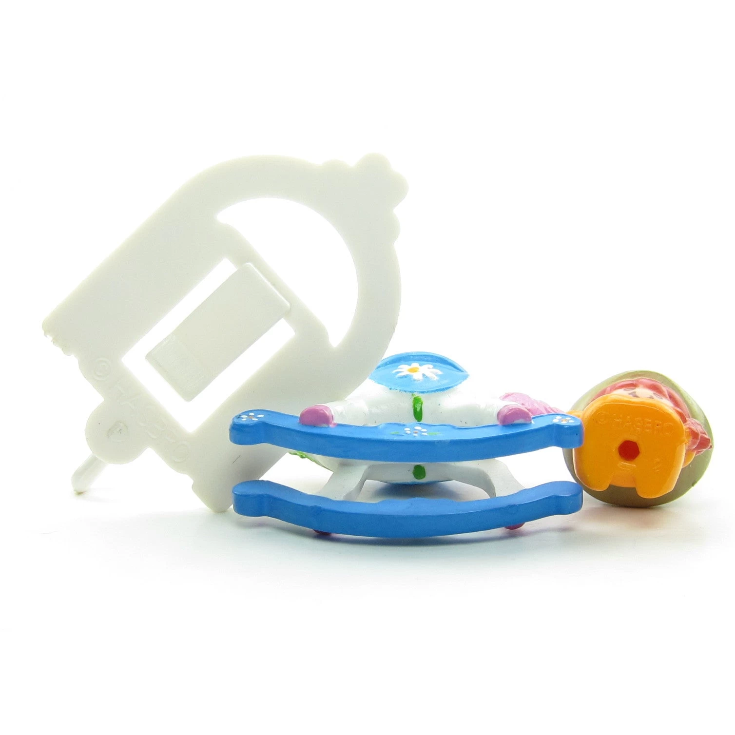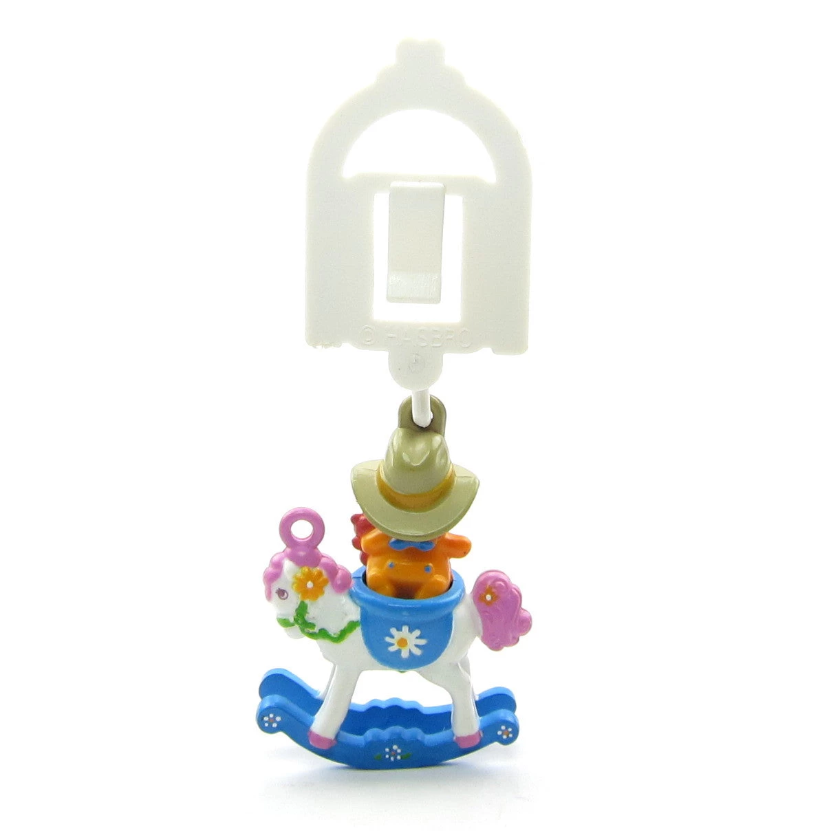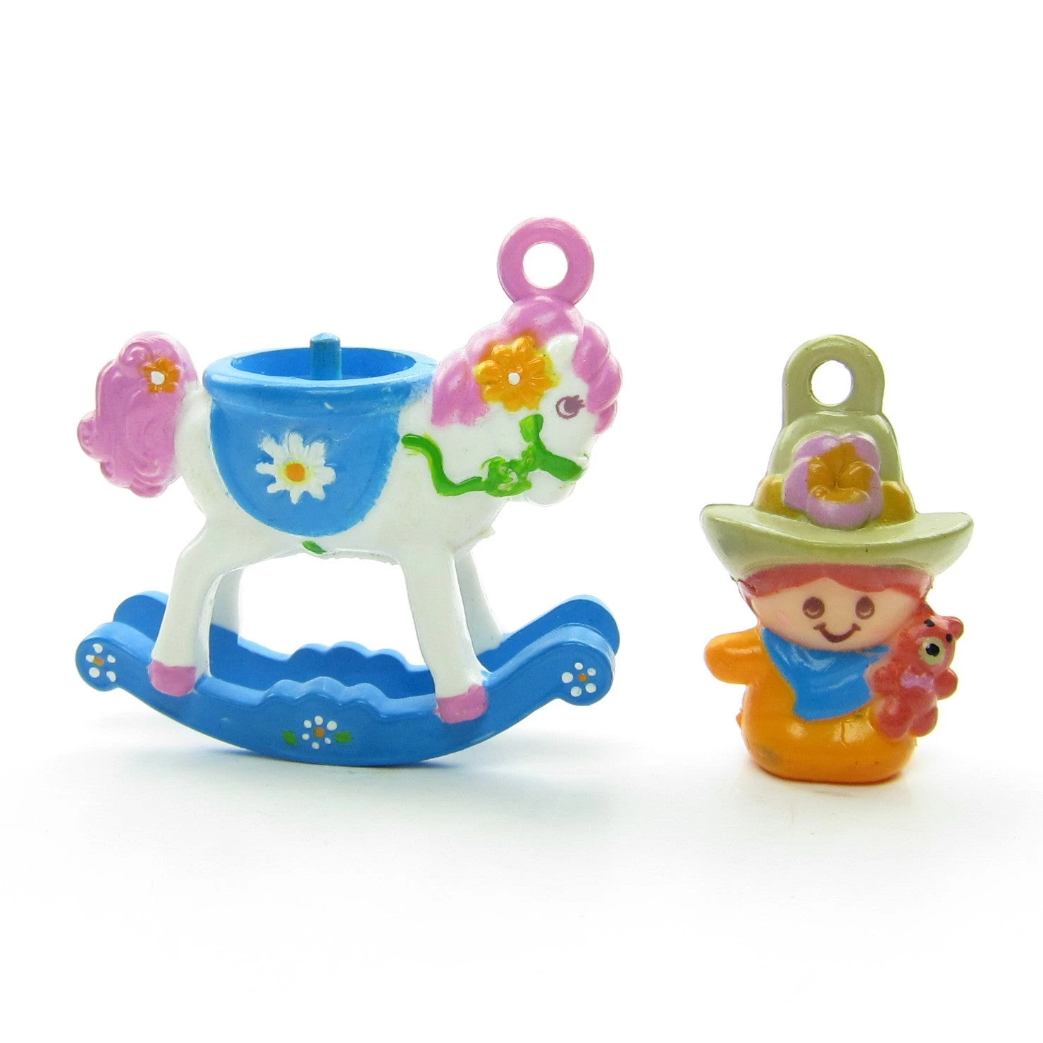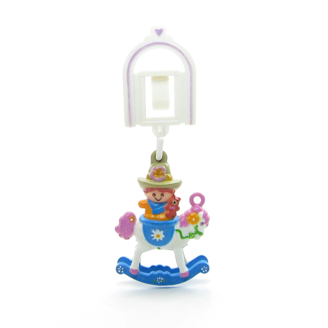 This vintage Charmkins set is Johnny Jump-Up with Lazy Daisy, it includes three separate pieces. There’s a white pocket clip with purple trim, a miniature cowboy named Johnny Jump-Up, and his rocking horse, Lazy Daisy. Johnny Jump Up wears a bandana and cowboy hat and is holding a tiny teddy bear.