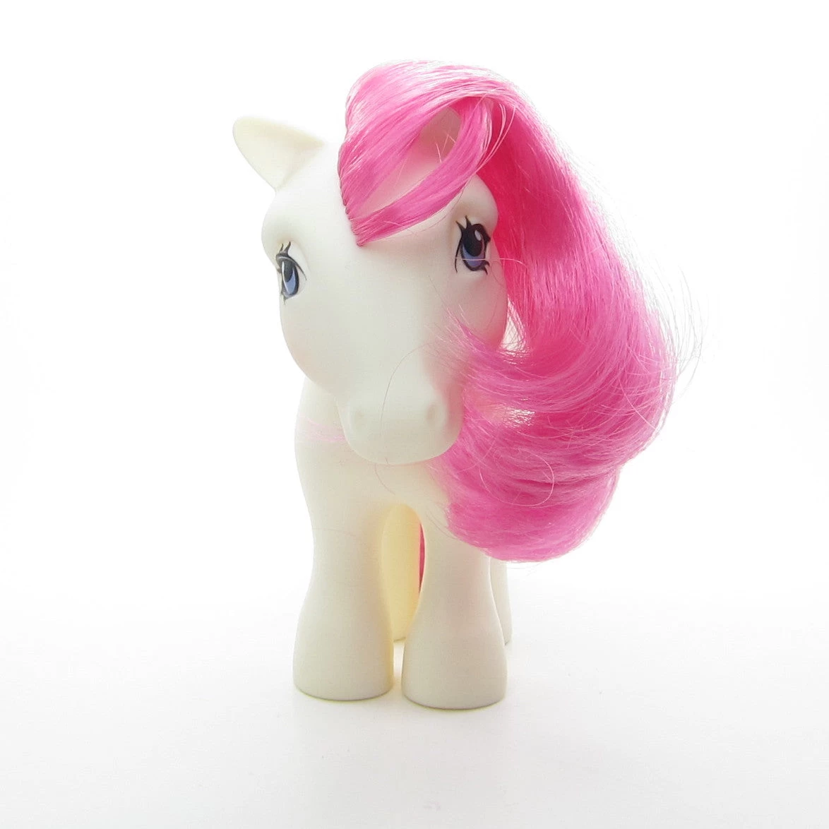 This vintage My Little Pony is Water Lily, she’s the Birthflower Pony for the month of July. She’s a white Earth pony with a bright pink mane and tail and purple eyes. Her symbol is a blue water lily, July’s birth flower.