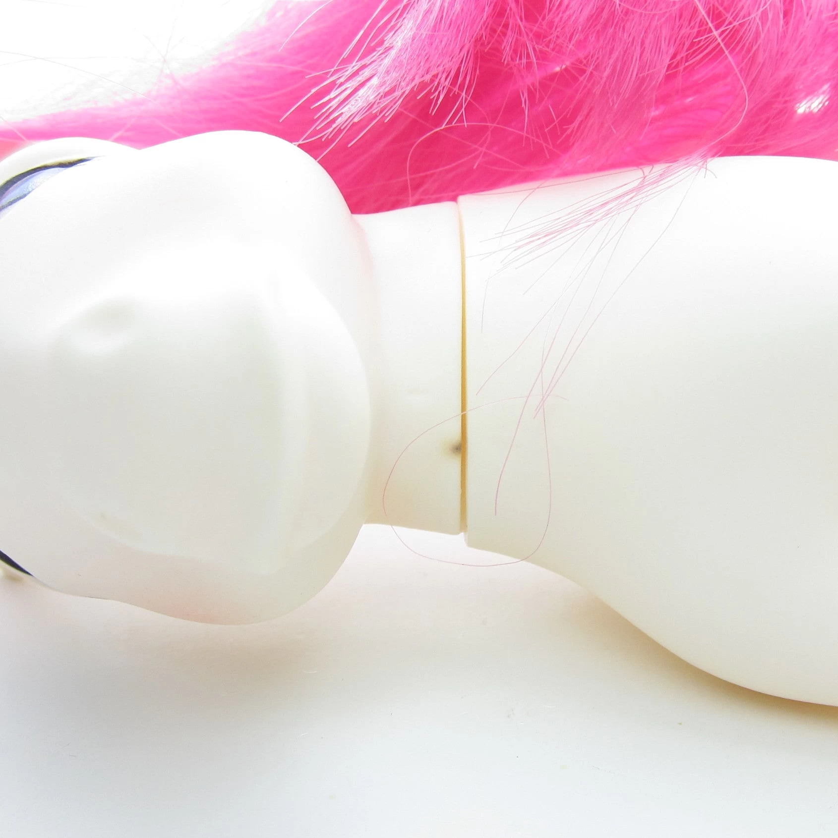 Water Lily’s hair is smooth and free of tangles. Her body has yellowed a little with age and she has a dark spot on her neck, as shown in the photos. She also has a few scuffs on the symbol on her display side. She’s otherwise in good vintage condition.