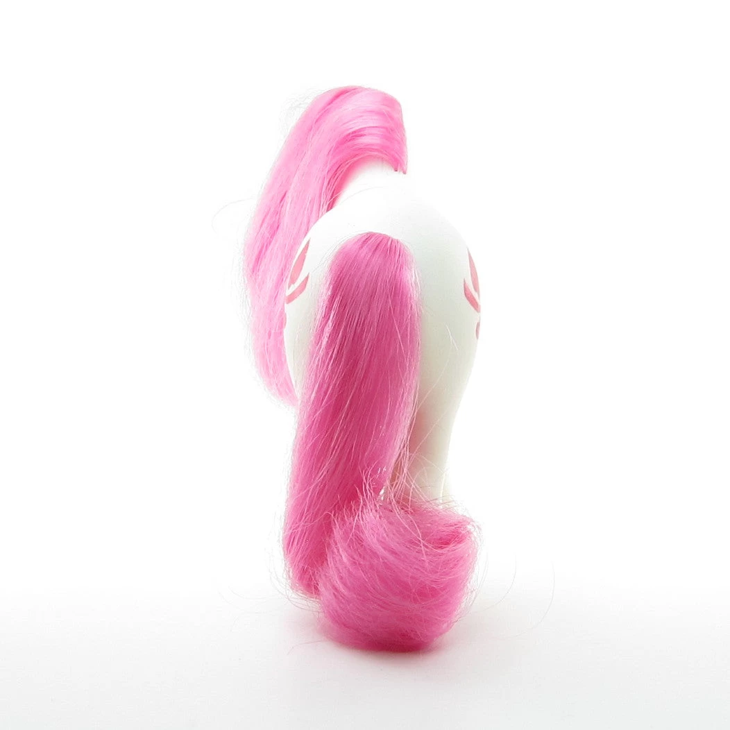 This vintage My Little Pony is Rose, she’s the Birthflower Pony for the month of June. She’s a white Earth pony with a bright pink mane and tail and purple eyes. Her symbol is a pink rose, June’s birth flower.