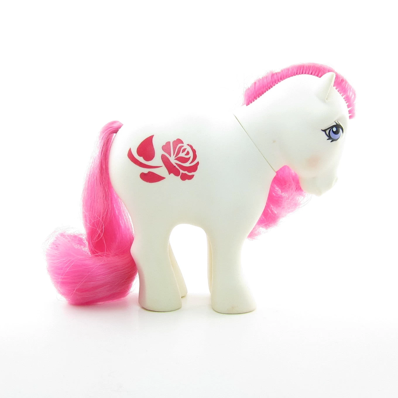 Rose’s hair is in good condition. Her body has yellowed a little with age and shows some dirt and scuffs, which is common for white ponies. She has a scuff in her cheek blush on her display side and a brown spot near her symbol on her non-display side. There are also some scuffs on her symbol and marker writing on the bottom of one foot, as shown in the photos.