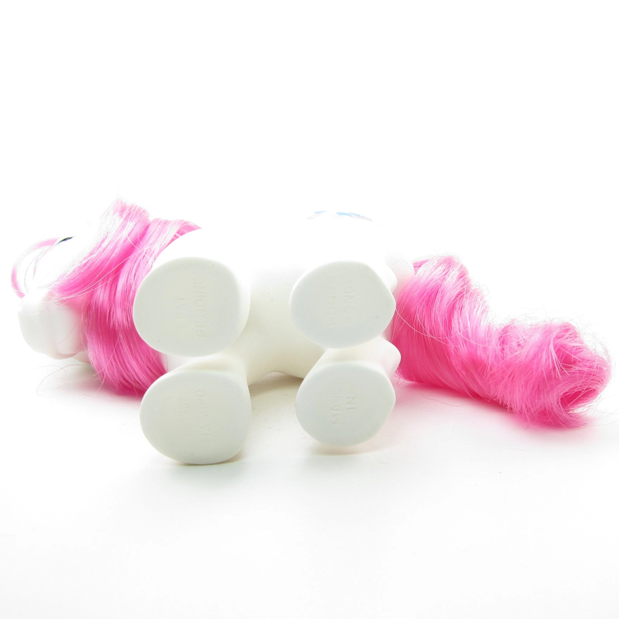 Li’l Tot’s hair is free of tangles and very smooth. Her body is clean and has none of the yellowing that usually occurs in white ponies. Her symbols are bright and clear. Her only flaw is a scratch in her display-side cheek blush, and this is mostly covered by her mane.Â