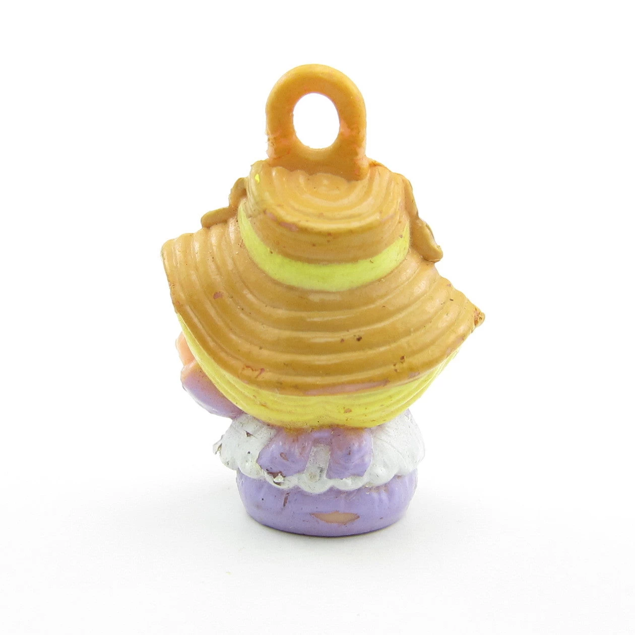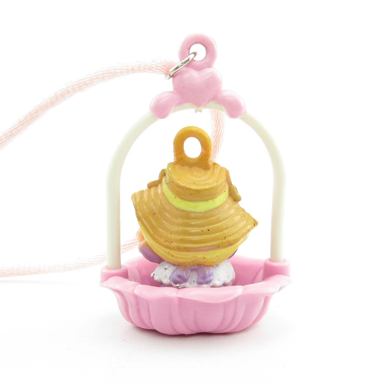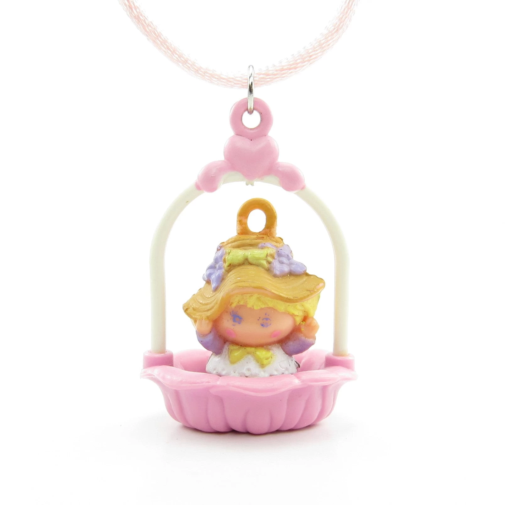 This vintage Charmkins charm is Lilybelle, she sits in her Sweetheart Swing pendant and hangs from a pink necklace. Lilybelle has short blonde hair and wears a brown straw hat with purple flowers and a yellow bow. Her dress is purple and white and her swing looks like a purple flower.