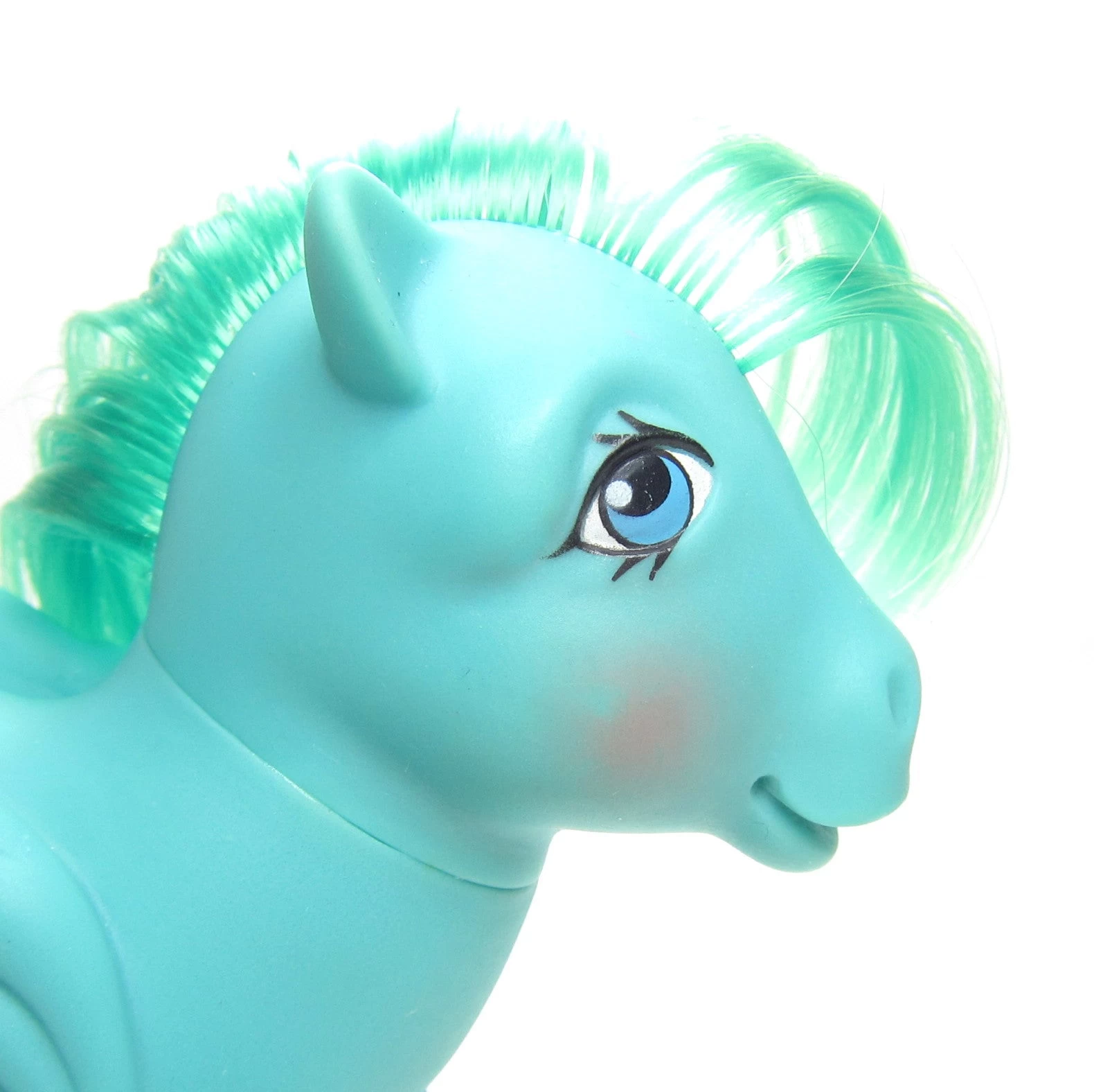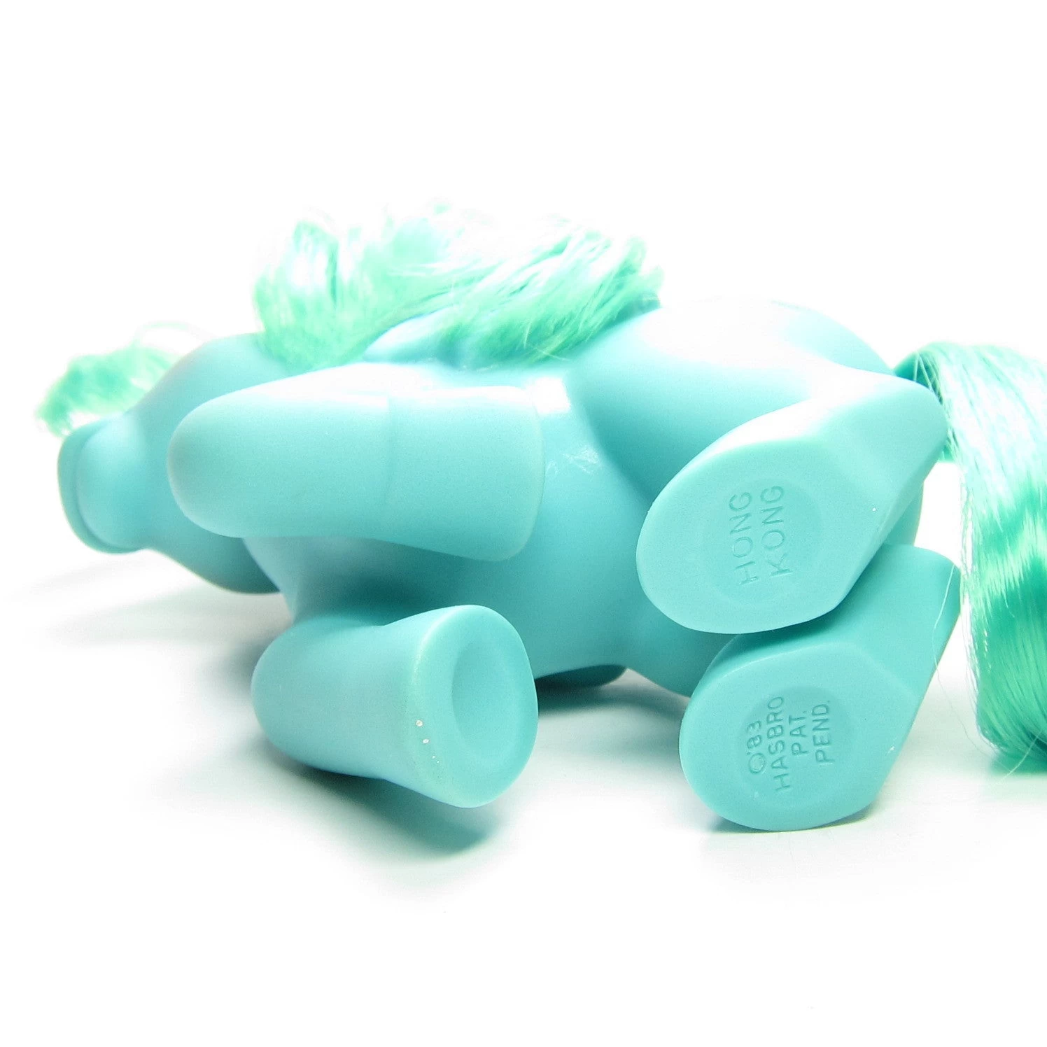 This vintage G1 My Little Pony is Medley, she’s a turquoise pegasus with green hair and blue eyes. Her symbol is five glittery green music notes. Medley first appeared in Year 2 of the My Little Pony line.