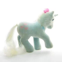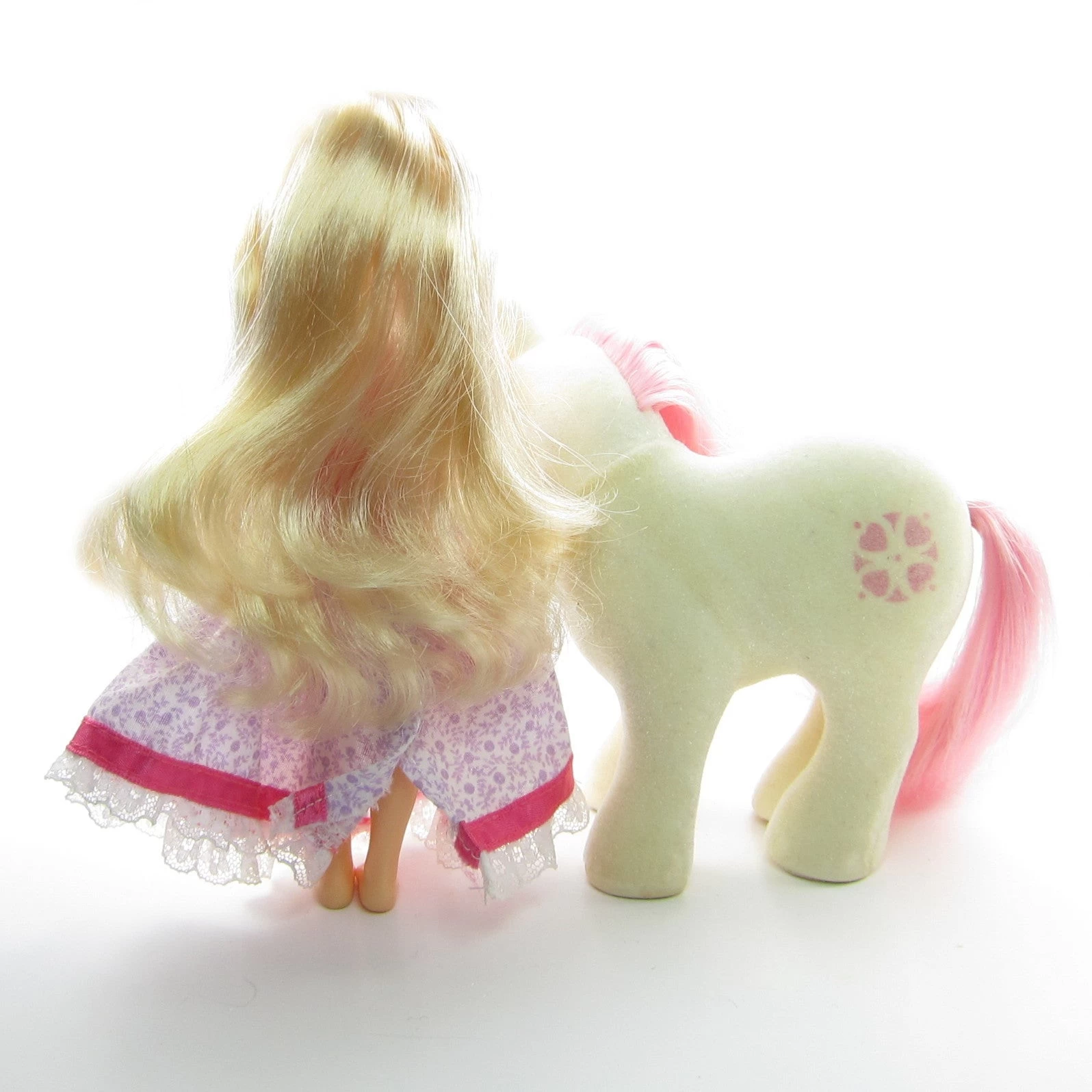 This version has Sundance as a flocked So Soft Pony. Her human friend, Megan, wears a white dress with miniature purple flowers and dark pink trim.