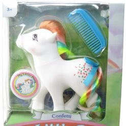 This vintage G1 My Little Pony set is Megan and So Soft Sundance from Year 4. It comes with Megan, So Soft Sundance, and the original body sticker. This set is a slightly different version of Megan and Sundance than the set released in Year 3.