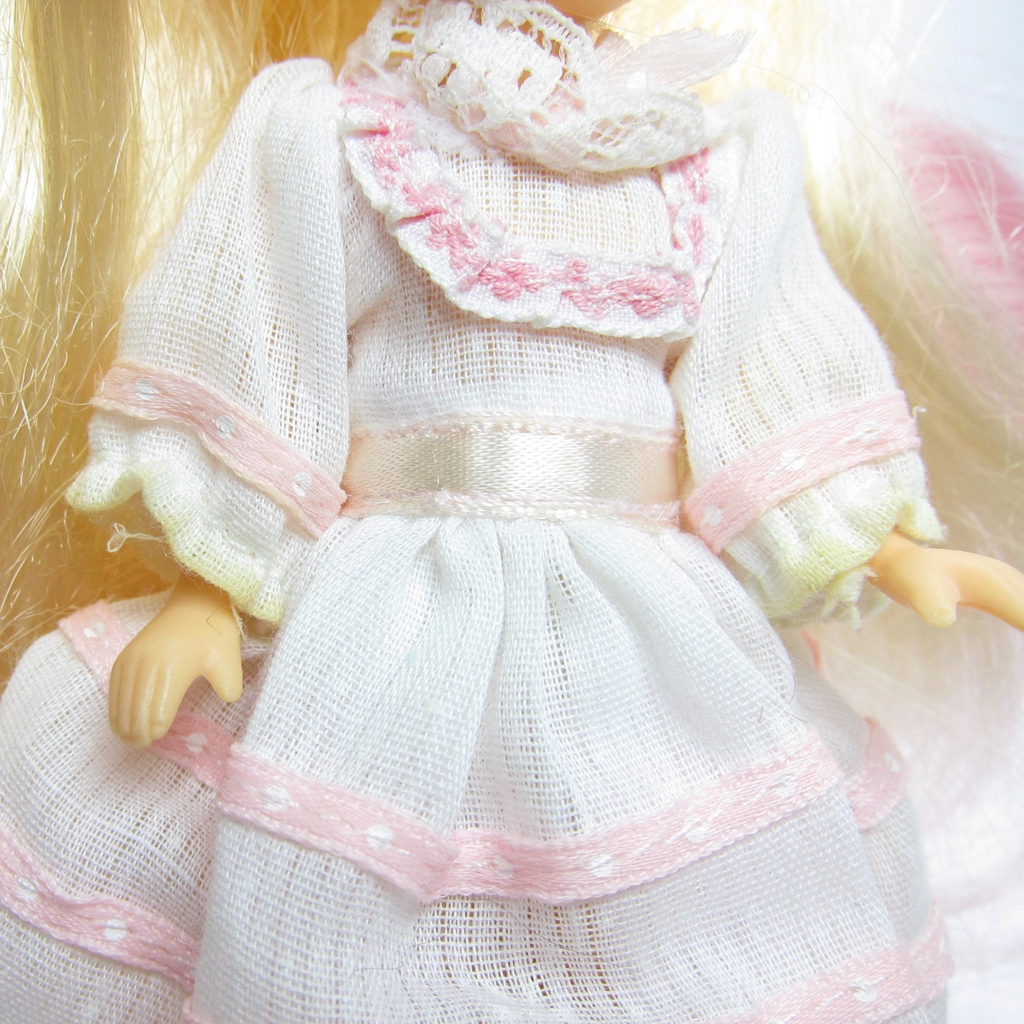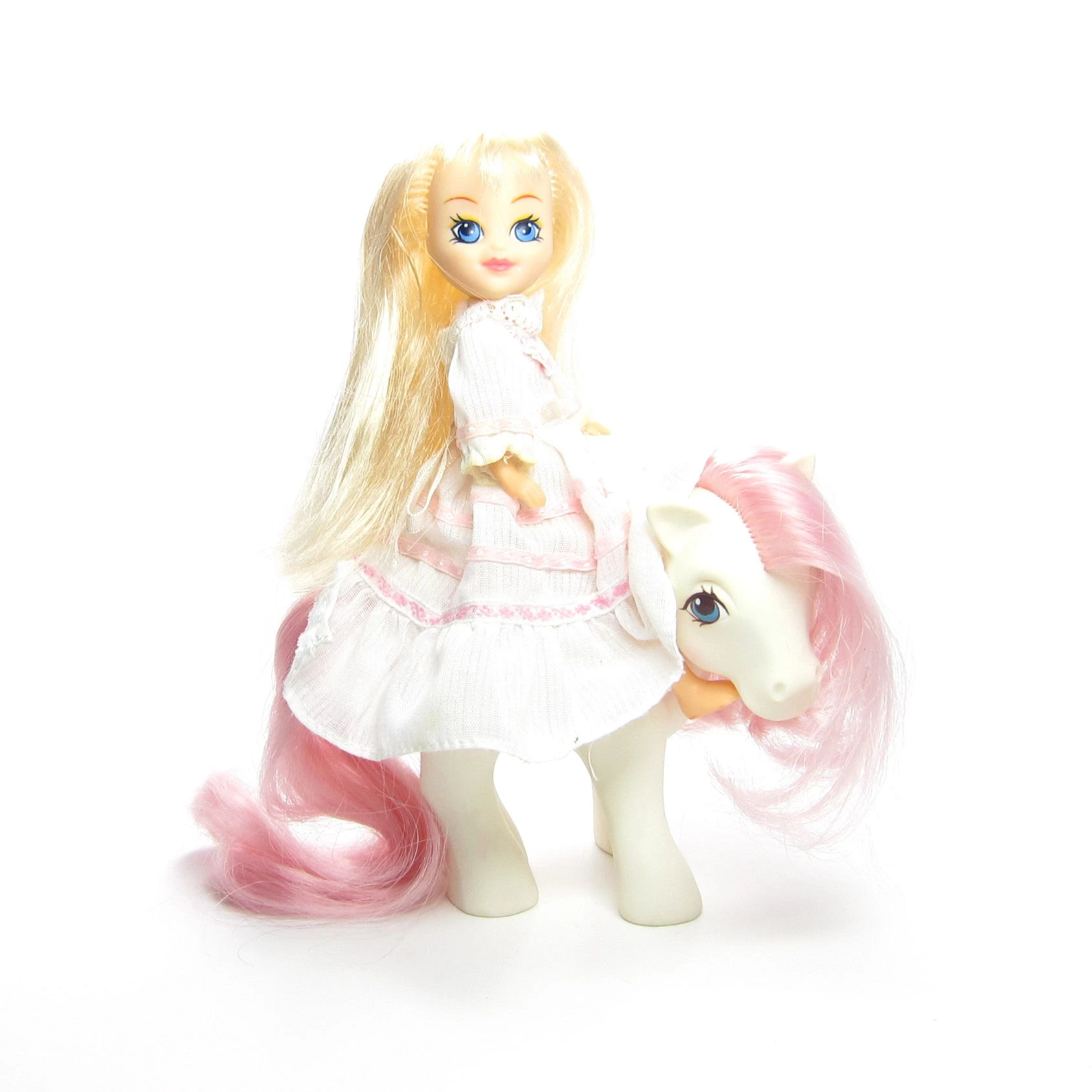 Megan has blue eyes and long blonde hair, she wears a white dress with pink trim. She’s missing her shoes, but wears white panties under her dress. Her arms and legs are poseable and her legs are flexible and rubbery so she can ride on top of Sundance or other ponies.Â