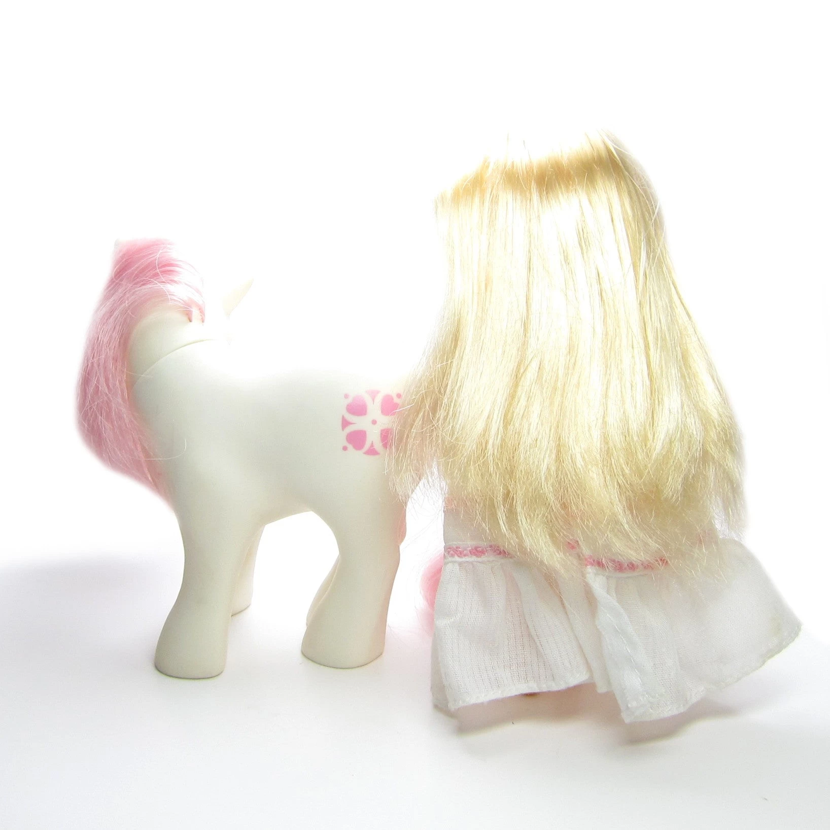 This vintage G1 My Little Pony set from Year 3 is Megan and Sundance. It includes a white pony, Sundance, and her human friend Megan. Sundance has pink hair and has a symbol with pink hearts and dots in a circle. She is standing in the Bow Tie Pose, with her head turned.