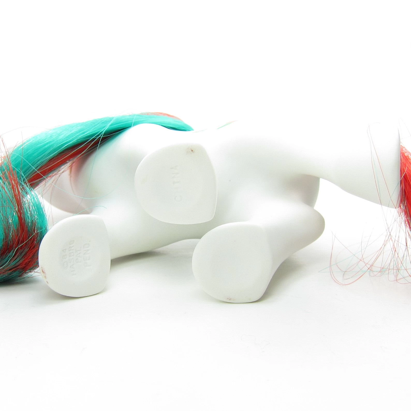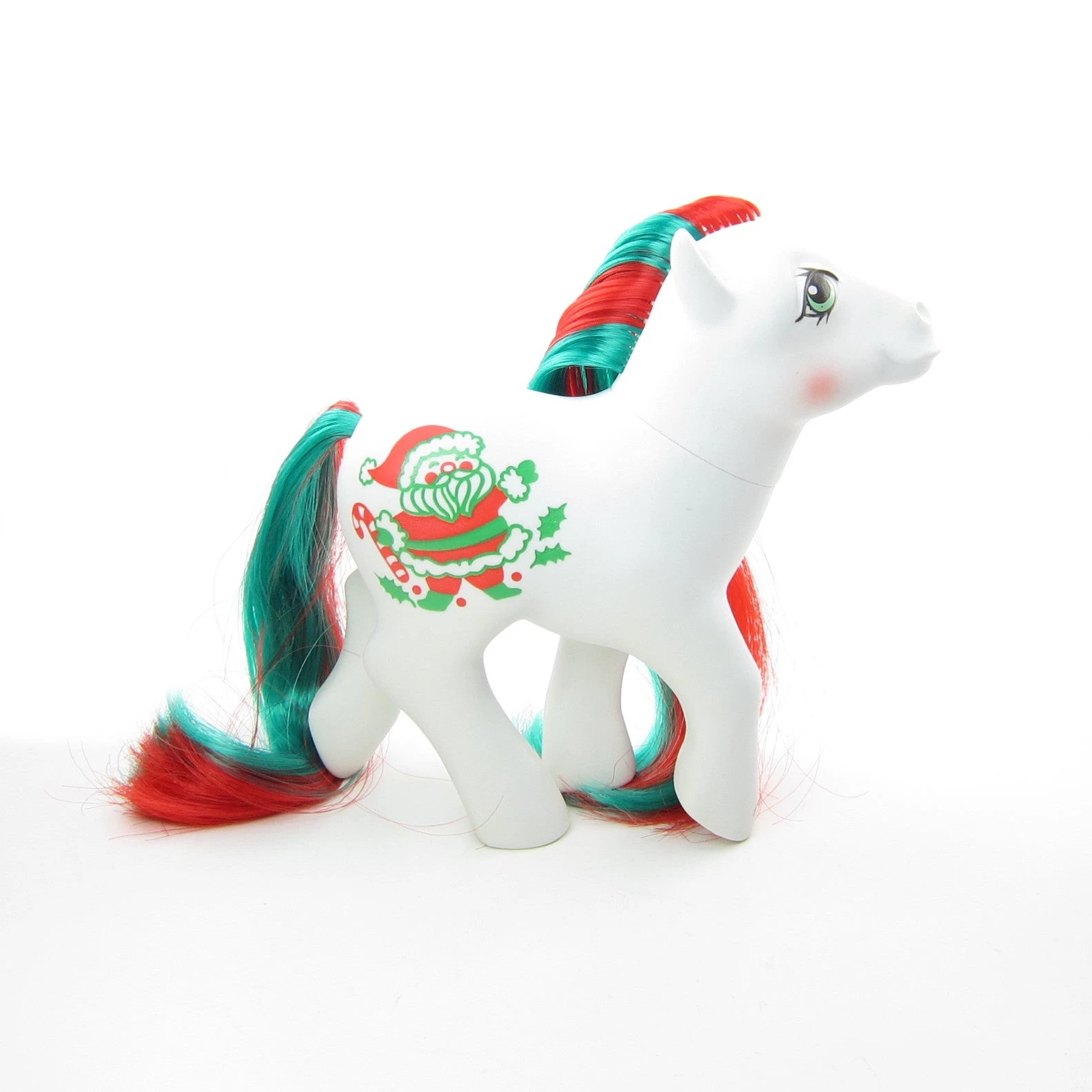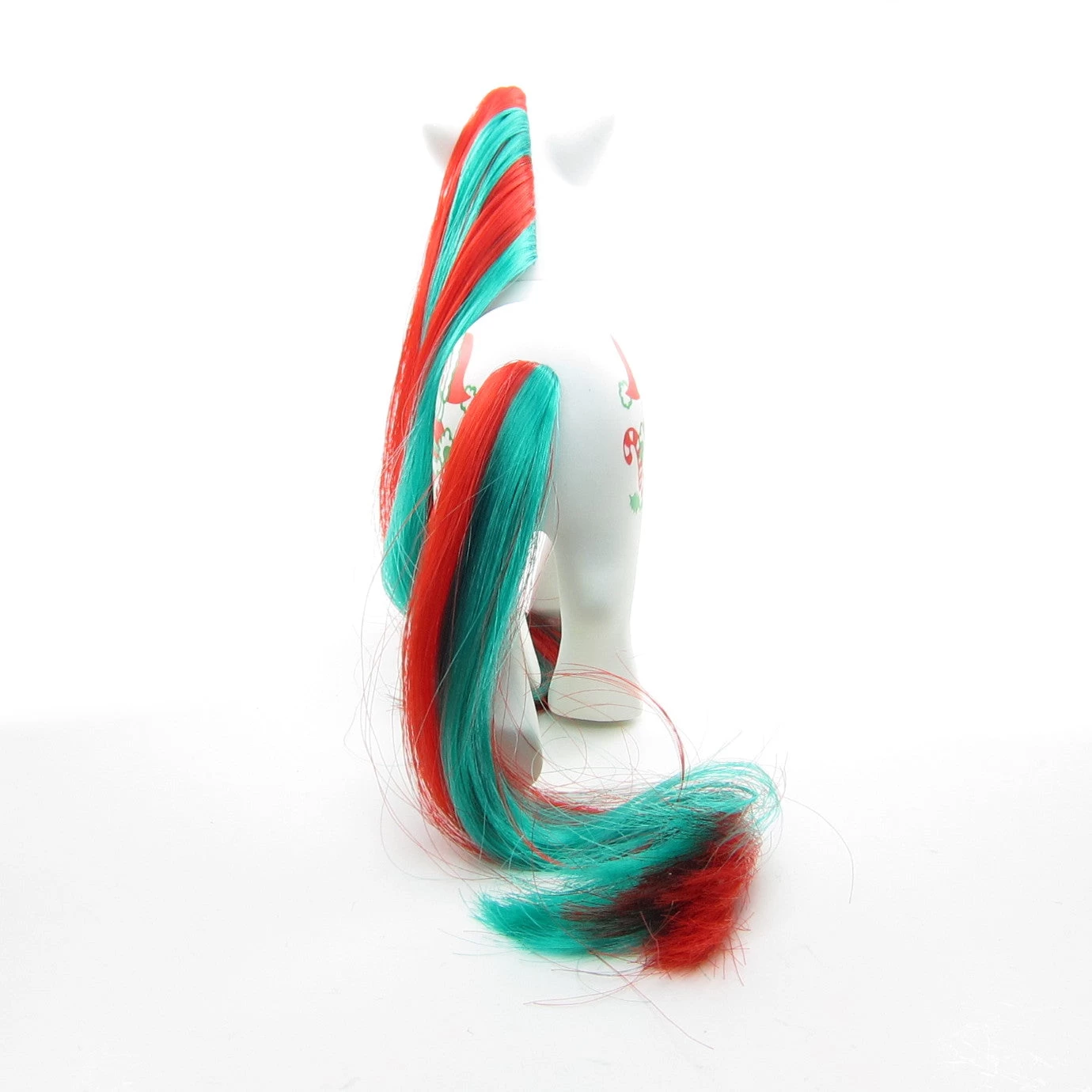 This vintage G1 My Little Pony is Merry Treat, she’s a white Earth pony that was released in Year 8 of the My Little Pony line. Her mane and tail are both very long with rich red and green colors. Her eyes are green and her symbol is Santa Claus holding a candy cane. There are also some holly leaves and berries.Â