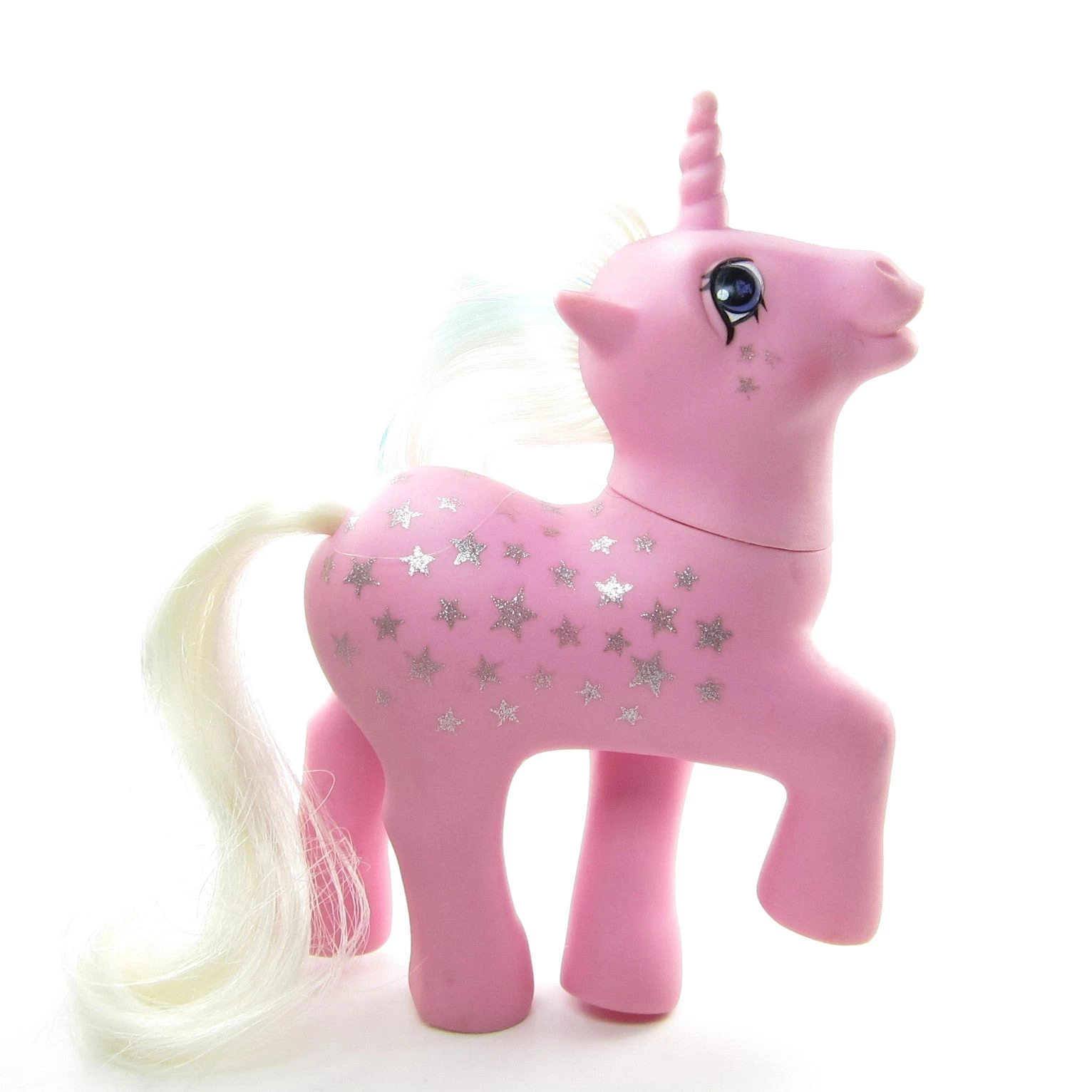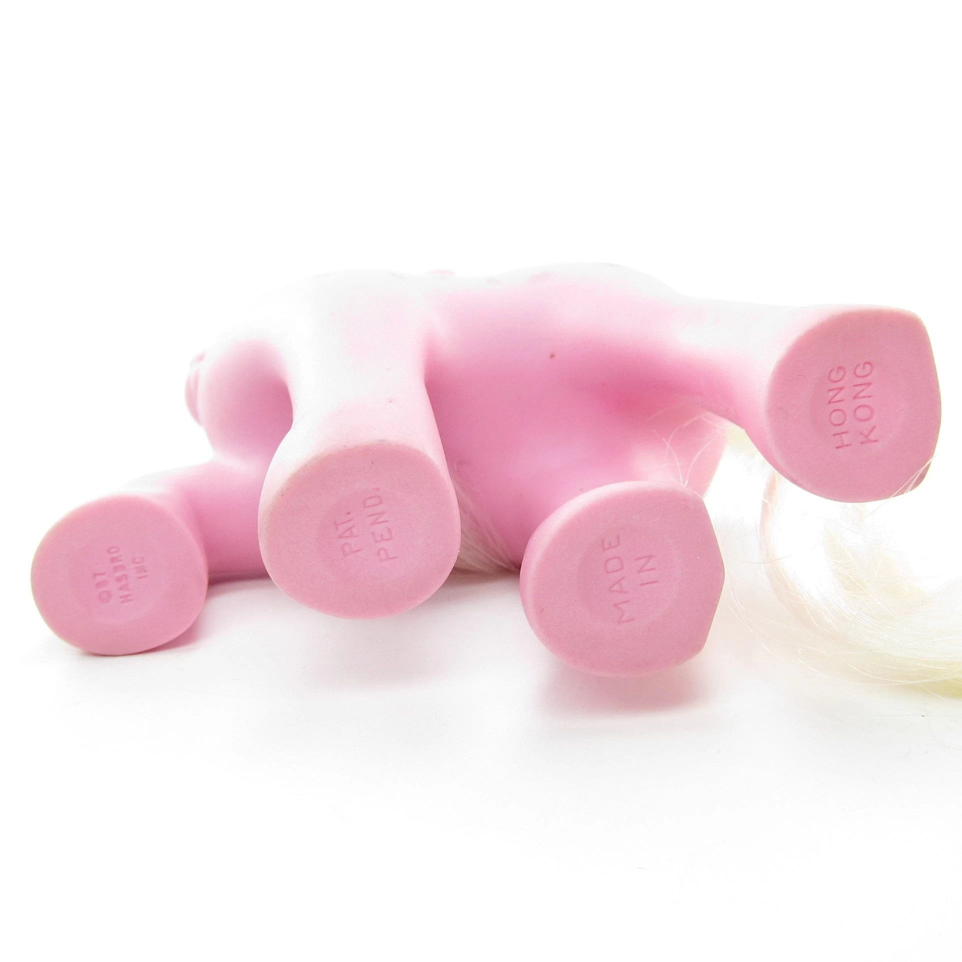 This vintage G1 My Little Pony is Milky Way, she’s a pink unicorn with purple eyes. Her tail is white and her mane is white with a blue stripe in it. Her symbol is silver stars.