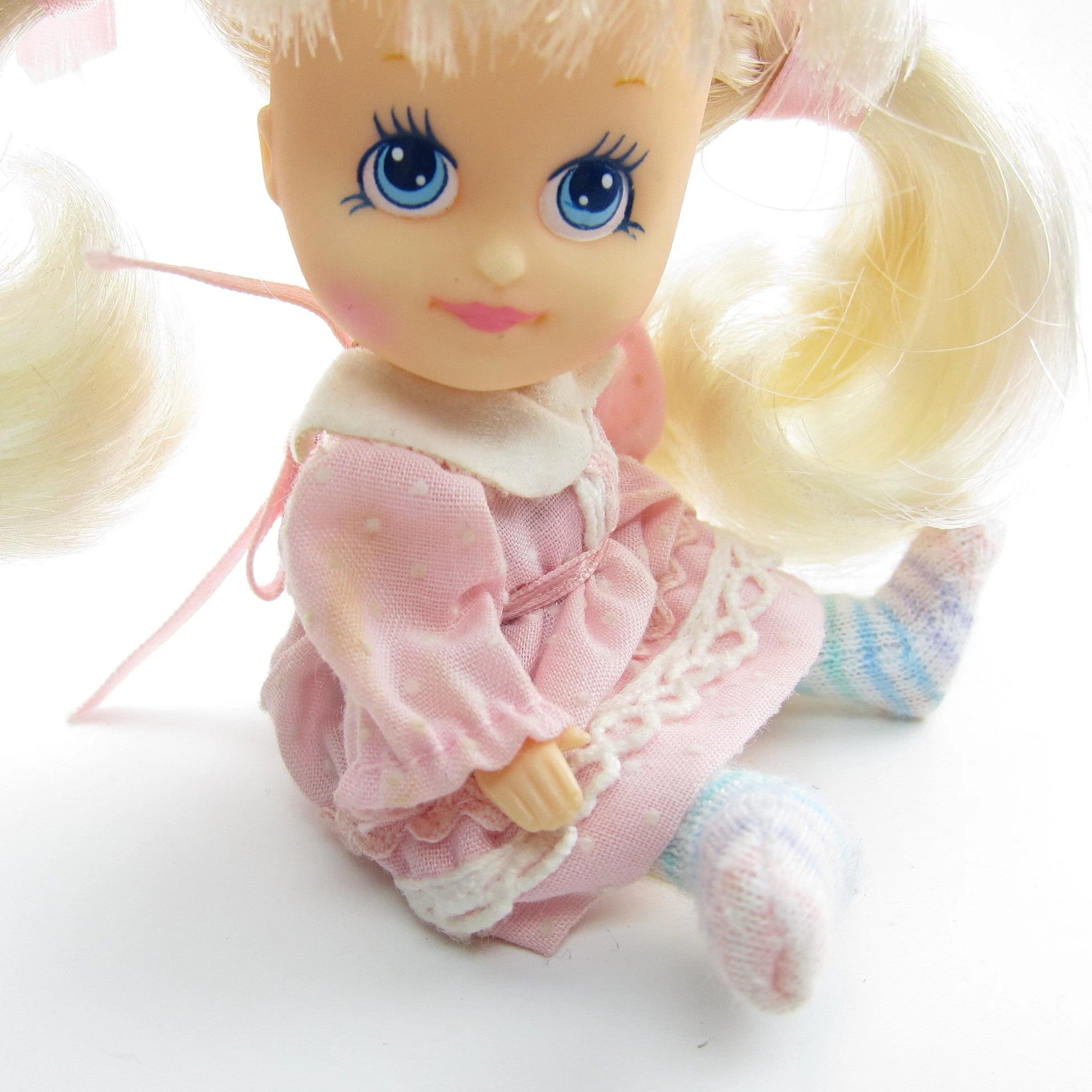 Molly has blue eyes and long blonde hair pulled into pigtails. Her pigtails are tied with the original pink ribbons. She wears a pink dress with white trim and tights with pastel stripes. She’s missing her white shoes.