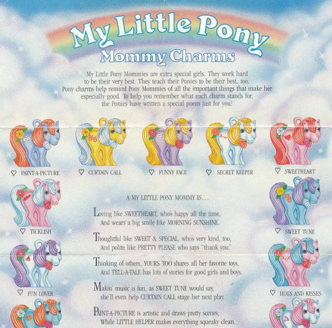 The Mommy Charms were originally available in Year 6 of the My Little Pony line in specially marked My Little Pony packages. There were 20 different charms to collect and a charm bracelet that was only available through a mail order offer.Â