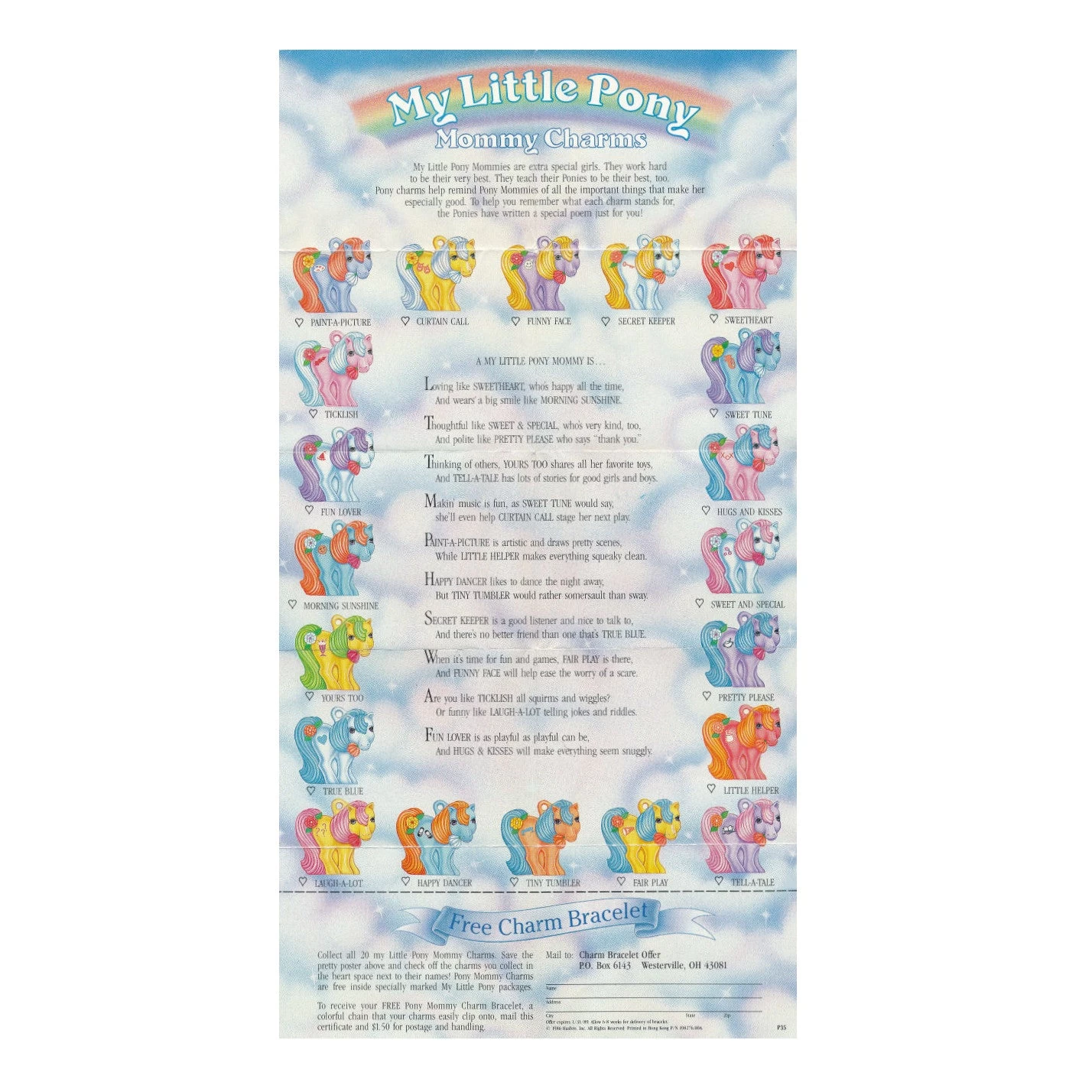 This vintage My Little Pony poster shows all of the Mommy Charms available and has a heart next to each one so you can check them off as you add to your collection. There’s also a “Free Charm Bracelet” certificate at the bottom of the poster.