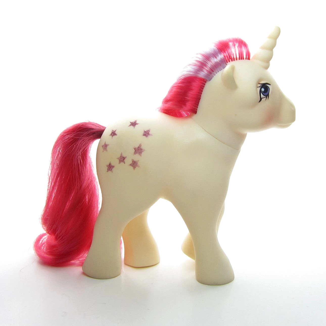 This vintage G1 My Little Pony is Moondancer, she’s a unicorn pony from Year 2. She’s white with a red tail and has a red mane with a purple streak in it. Her symbol is a glittery silver crescent moon surrounded by 8 glittery stars and her eyes are purple.