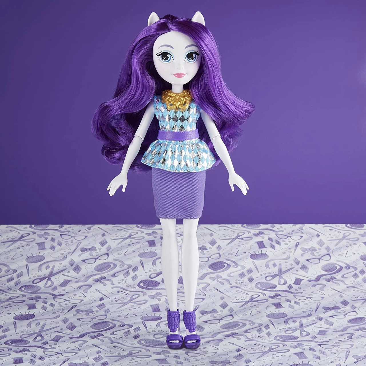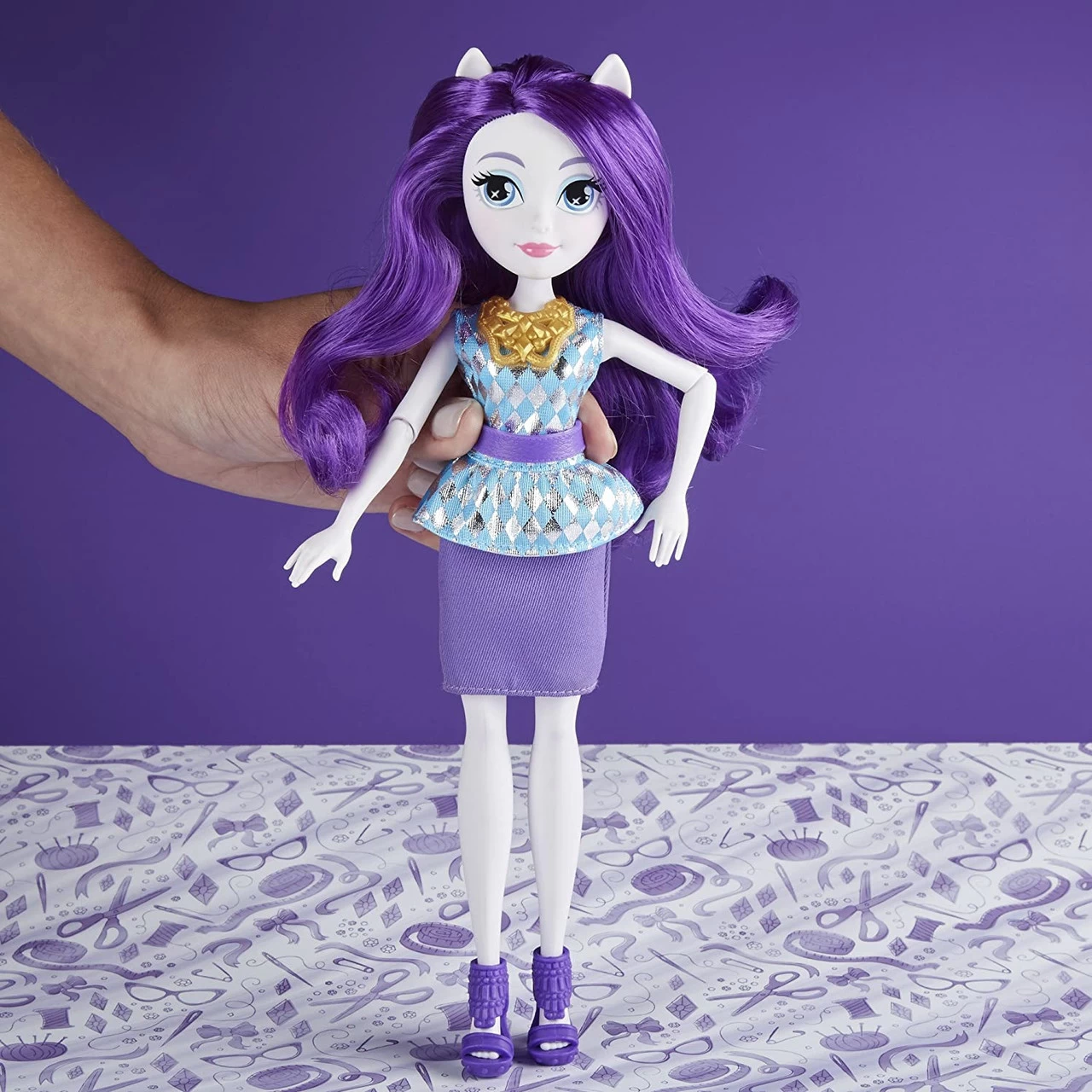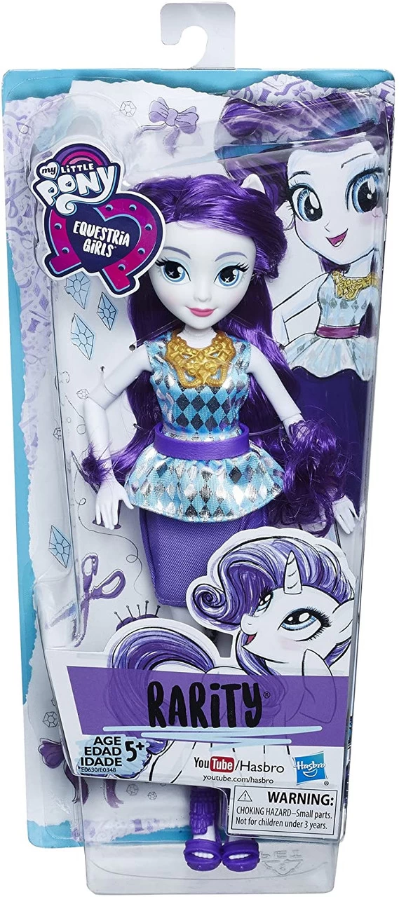 Rarity has her finger on the fashion pulse, and her fashion sense shines with sophisticated style! Inspired by entertainment, This 11-inch Rarity fashion doll is dressed in a chic outfit, complete with fashion accessories. Her Cutie Mark is represented in the shiny pattern on her top. She has 7 points of articulation for imagining friendship-filled stories down the halls of Canterlot high and beyond!